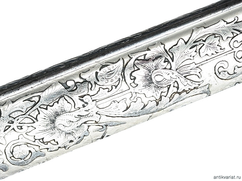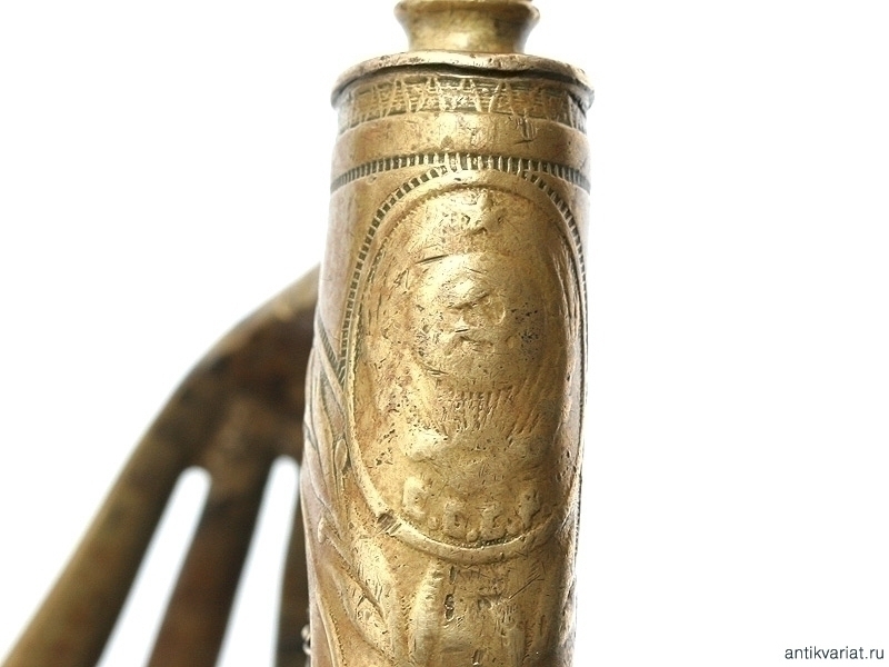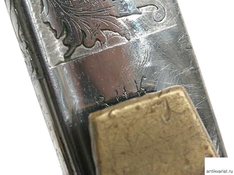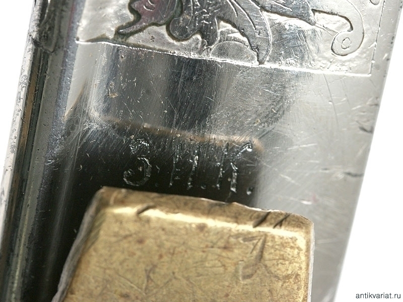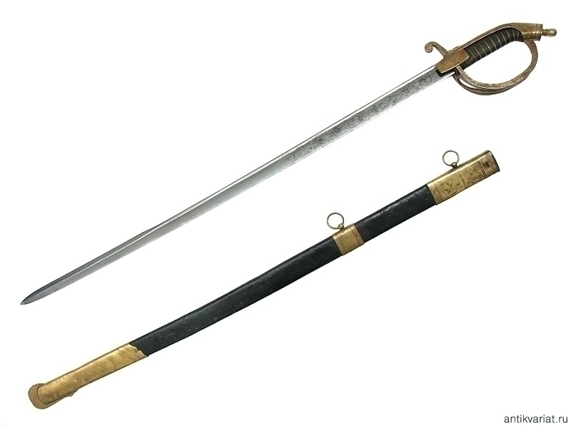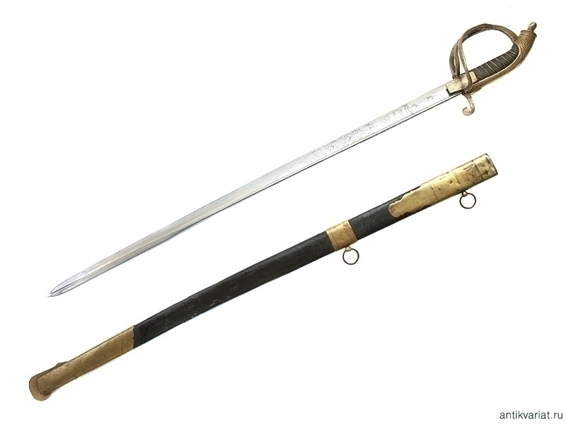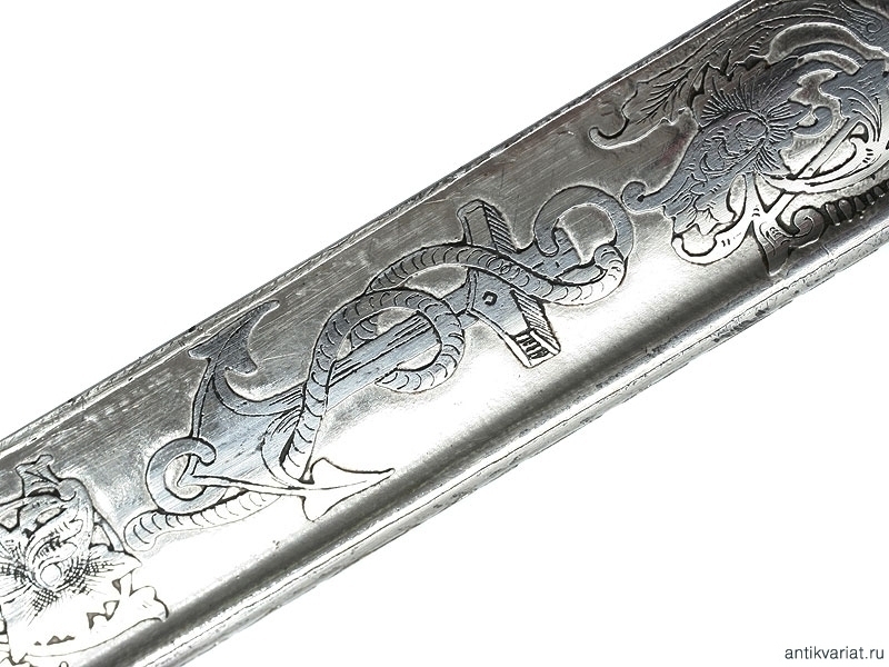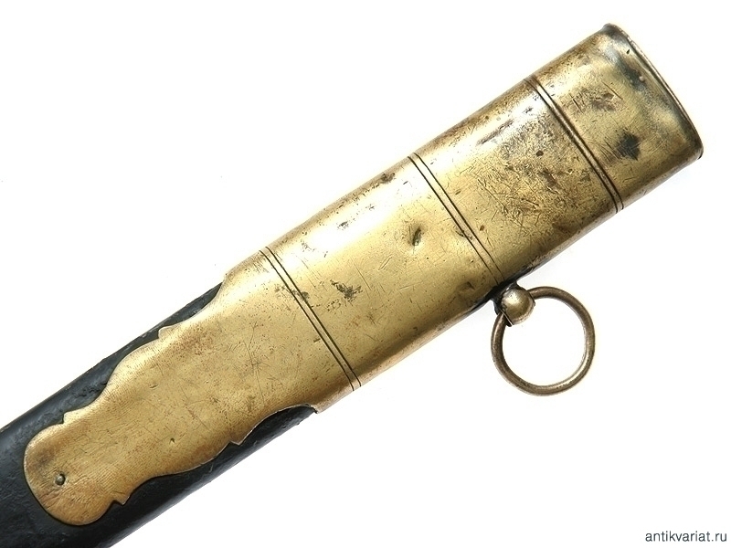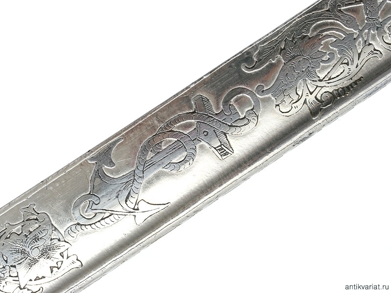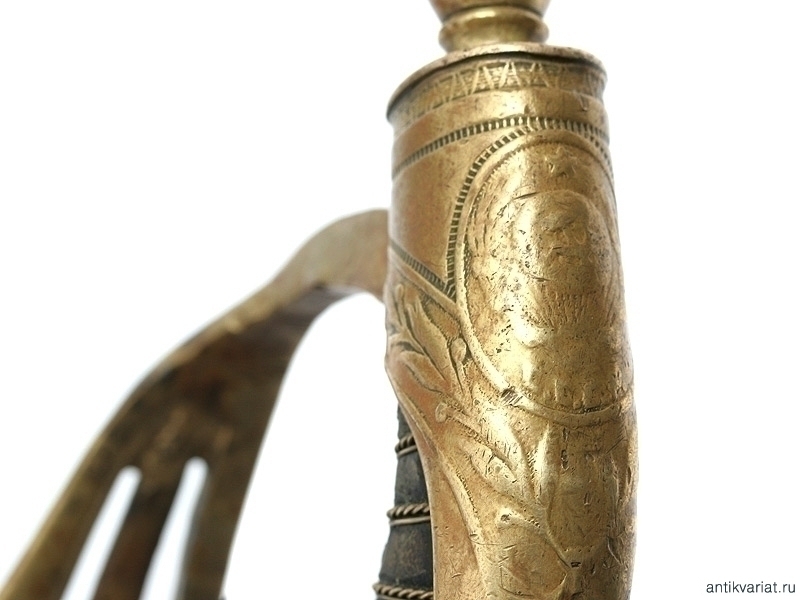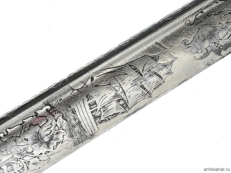 Палаш морской командирский образца 1929 года. Клинок германского производства, дореволюционного изготовления, украшен травлением на морскую тематику, никелированный. У основания клинка - клеймо Златоустовского инструментального комбината, где клинок был использован при изготовлении палаша в 1936 году (в 1920-е - 1930-е годы использование дореволюционных частей при изготовлении холодного оружия в Златоусте не редкость - видимо, был определенный запас). С другой стороны помещен номер "100" (вероятнее всего, номер изделия либо заказа). Рукоять деревянная, обтянутая кожей, перевитой по поперечным желобкам витой проволокой. Прибор рукояти бронзовый, на спинке рукояти - герб СССР раннего образца. Прибор потерт, тем не менее в труднодоступных для чистки местах сохранилось оригинальное золочение. Ножны деревянные, обтянутые черной кожей, с бронзовым прибором, также сохранившим следы золочения.