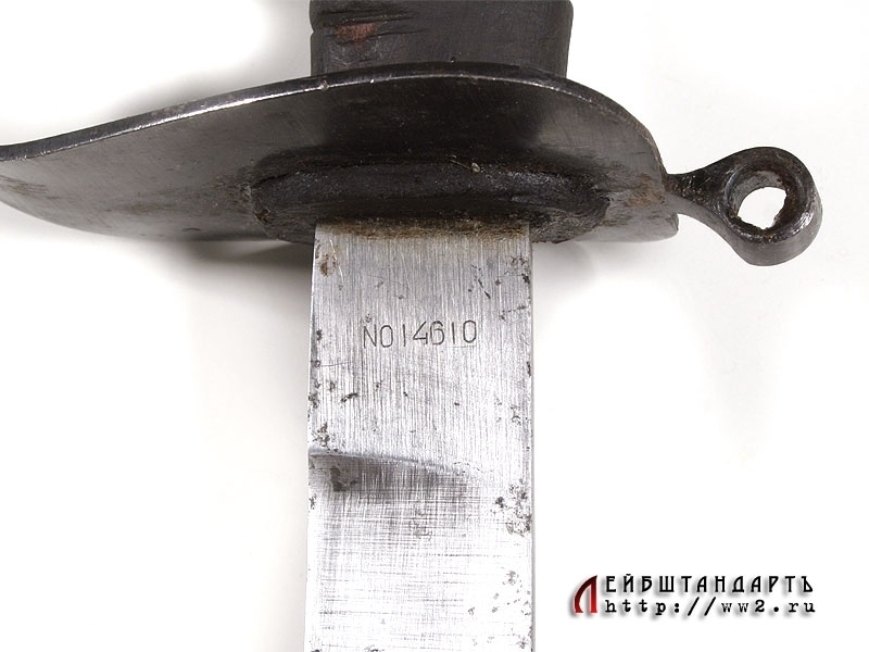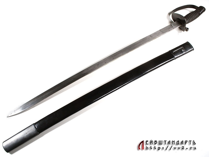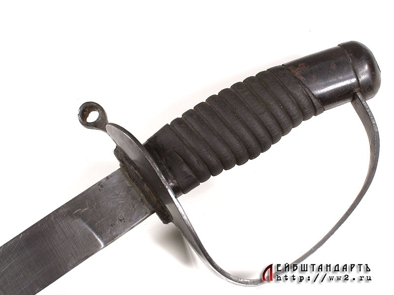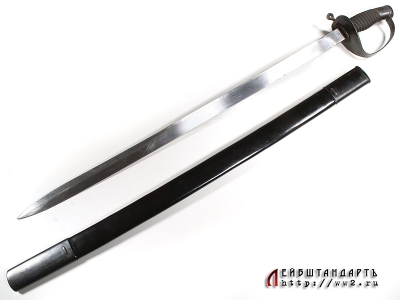 Палаш морской курсантский образца 1940 года в превосходной сохранности. Клинок без долов, у основания присутствует номер. Рукоять деревянная, с поперечными желобками. Весь металлический прибор рукояти изготовлен из стали и покрыт воронением. Ножны деревянные, покрыты черным лаком. Железный прибор состоит из вороненых устья и наконечника.