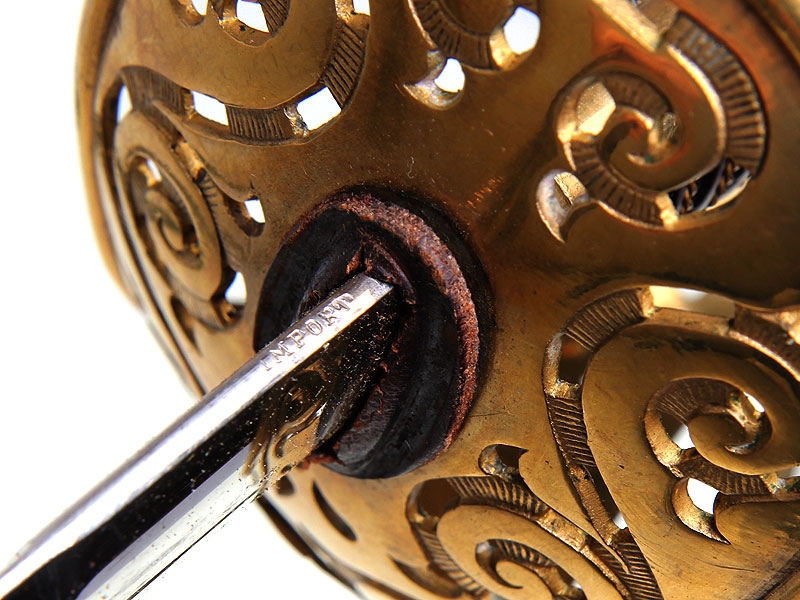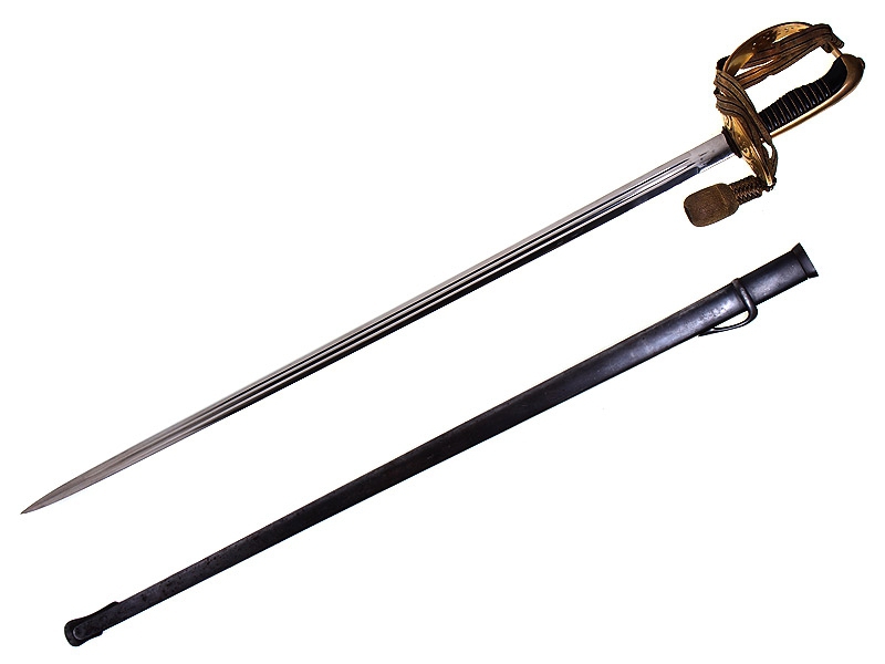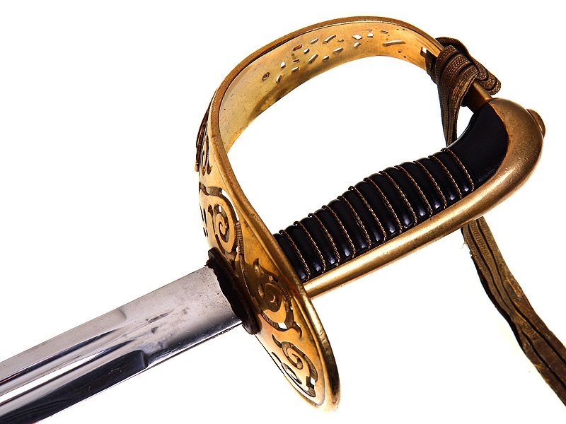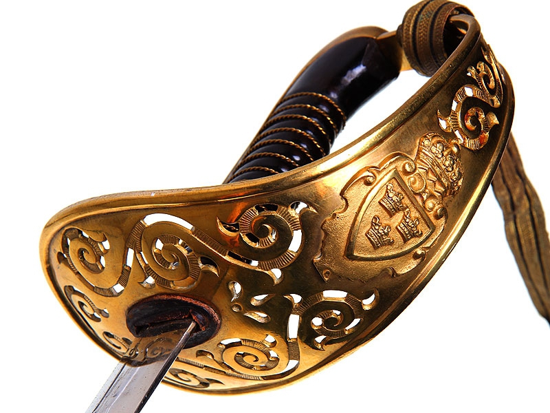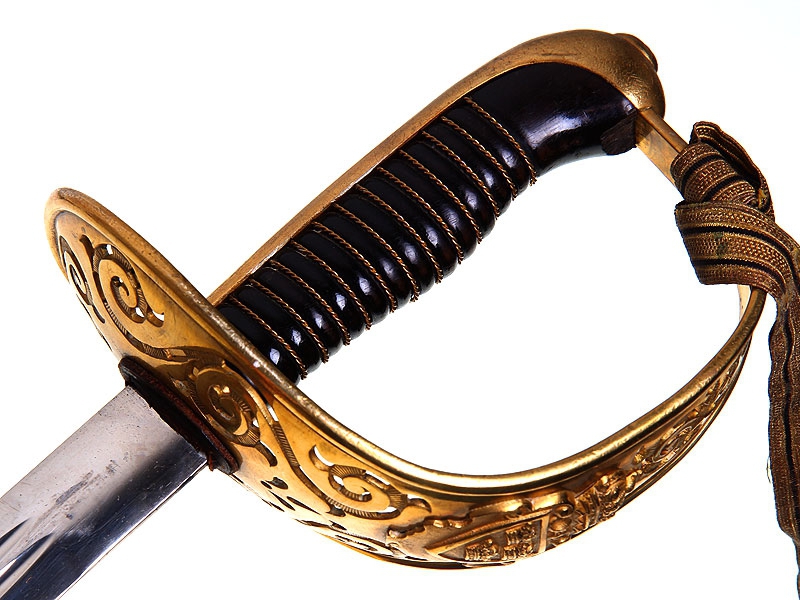 Офицерский гвардейский палаш образца 1893 года. Клинок без клейм. Рукоять деревянная, перевитая латунной проволокой, прибор рукояти из позолоченной бронзы. На чашке гарды - накладное изображение щита с гербом Швеции. Ножны металлические вороненые. Хорошо сохранился оригинальный темляк.
