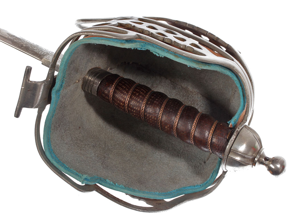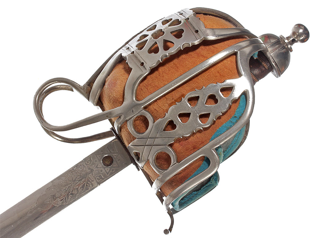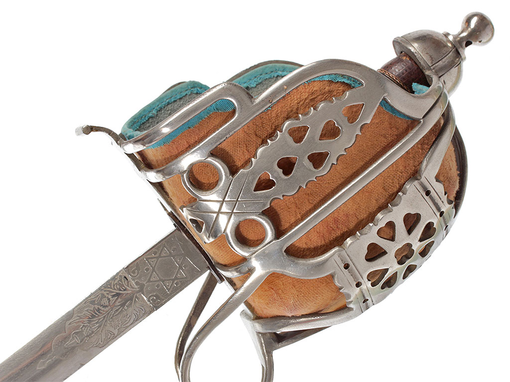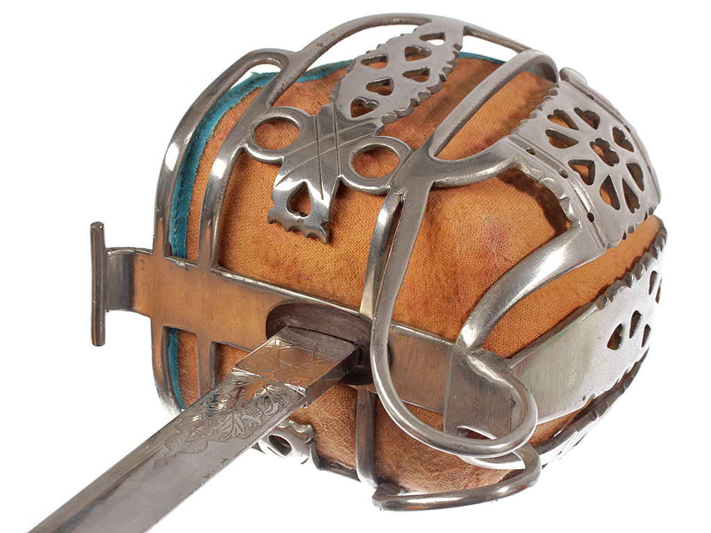 Эфес состоит из рукояти и гарды; металлические части выполнены из стали. Прямая деревянная рукоять обтянута кожей и опоясана по диагональным желобкам семью витками крученой латунной проволоки. Рукоять увенчивает полусферическая головка-набалдашник. Шаровидная гайка на высокой ножке закрепляет рукоять на хвостовике клинка. В нижней части рукоять охватывает овальная втулка с двумя выточенными поясками. Стальная гарда образована ансамблем разноформатных ажурных дужек, формирующих глубокую защитную чашку закрытого "корзинного" типа. Под прямыми углами они соединены с прямой плоской крестовиной, передняя часть которой оканчивается завитком, а задняя соединена с дужками парой волютообразно изогнутых штырей. Широкие поверхности центральной, двух больших и двух малых боковых дополнительных дужек прорезаны отверстиями в форме сердечка; на центральной дужке они образуют подобие "готической розы". В защитной чашке - оригинальная вставка из выкрашенной в красный цвет плотной замши с синим тканевым кантом.