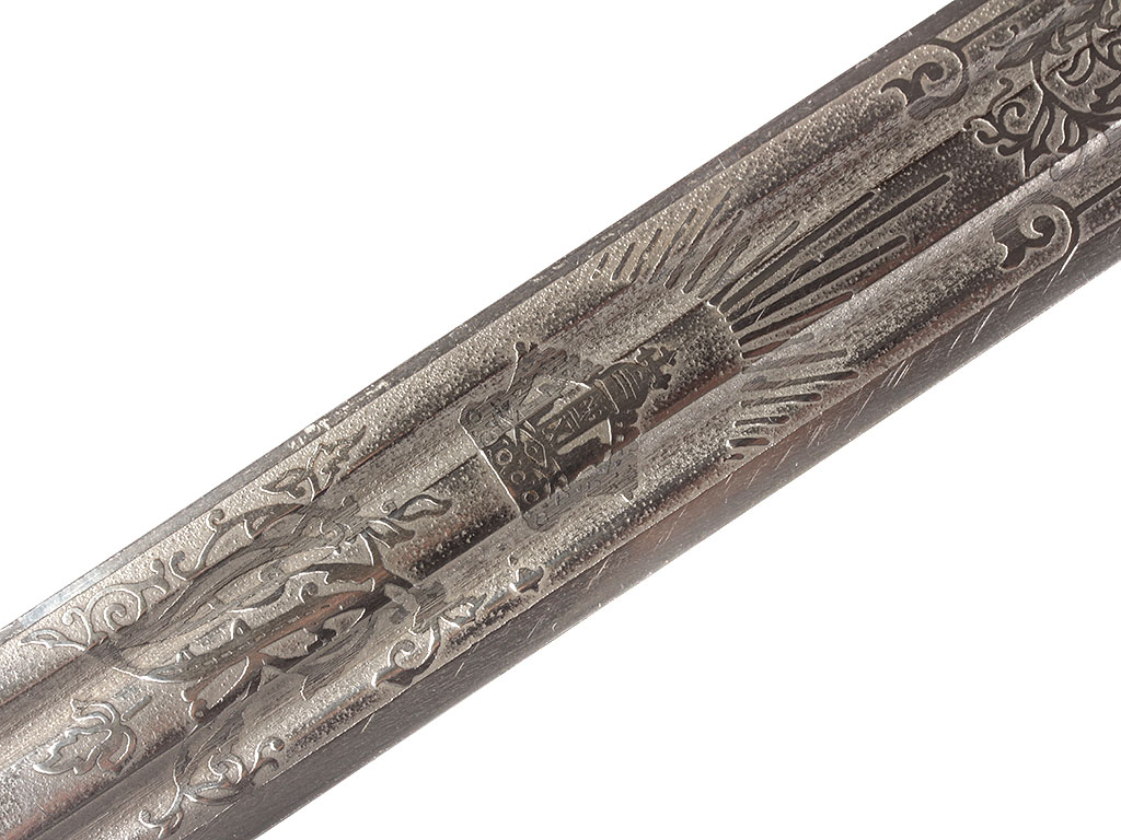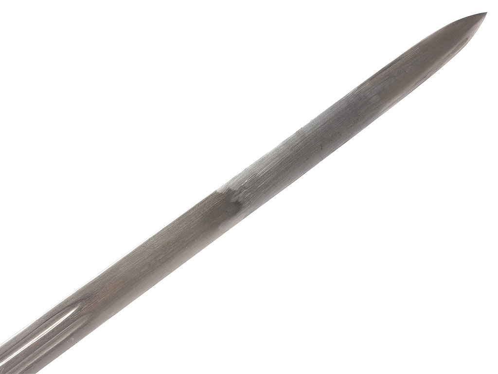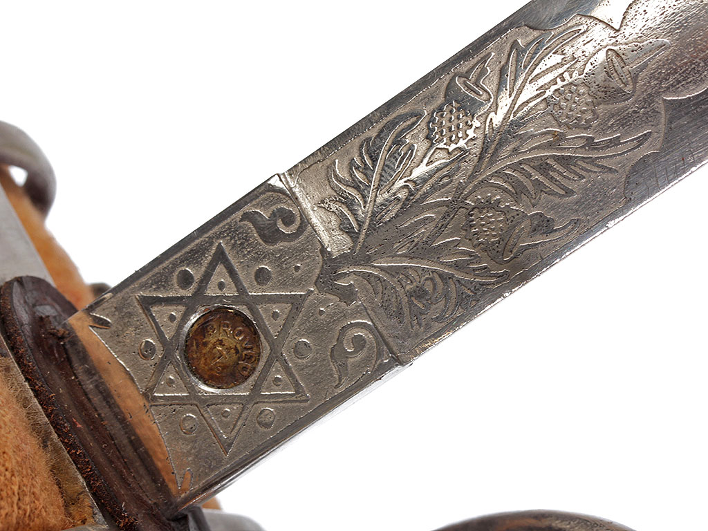 Офицерский палаш легкой пехоты шотландских горцев образца 1828 / 1831 года. Клинок стальной, прямой, линзовидного сечения, на большей части полотна двудольный (долы равновеликие), острие по центральной оси. Пята четко выражена, прямоугольной конфигурации. Обе стороны клинка покрыты травленым узором, состоящим из растительного орнамента (побеги чертополоха) с элементами геральдики – вензелем британской королевы Виктории "VR" под короной "тюдоровского" типа с расходящимися от неё веером лучами на левой голомени. На правой пяте клинка выставлен британский знак удостоверения - утопленная латунная шайба с надписью "Proved", вписанная в изображение шестиконечной звезды.
