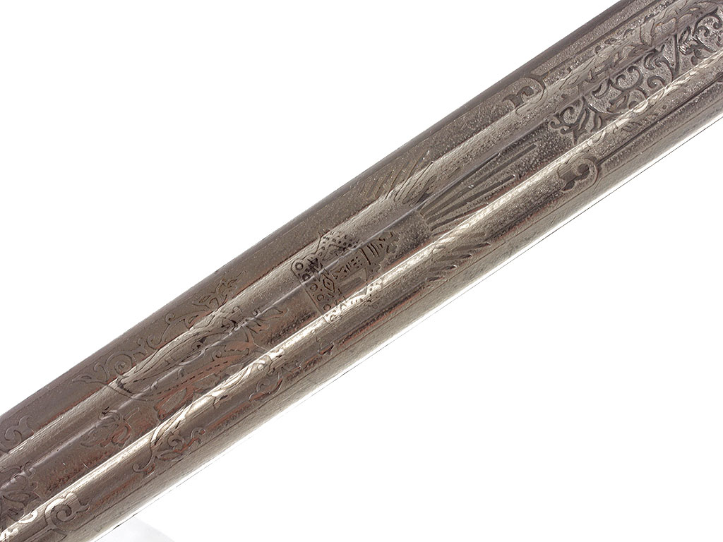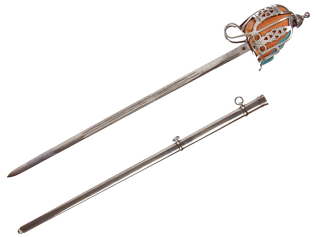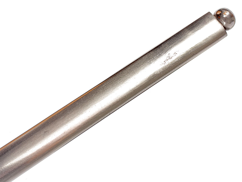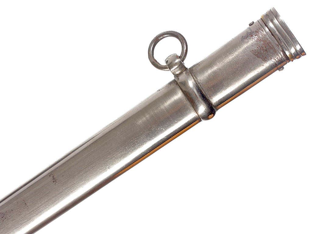 Ножны цельнометаллические никелированные, с узким устьем, крепящимся к ножнам двумя торцевыми винтами, c двумя обоймицами с портупейными кольцами и сферическим завершением.