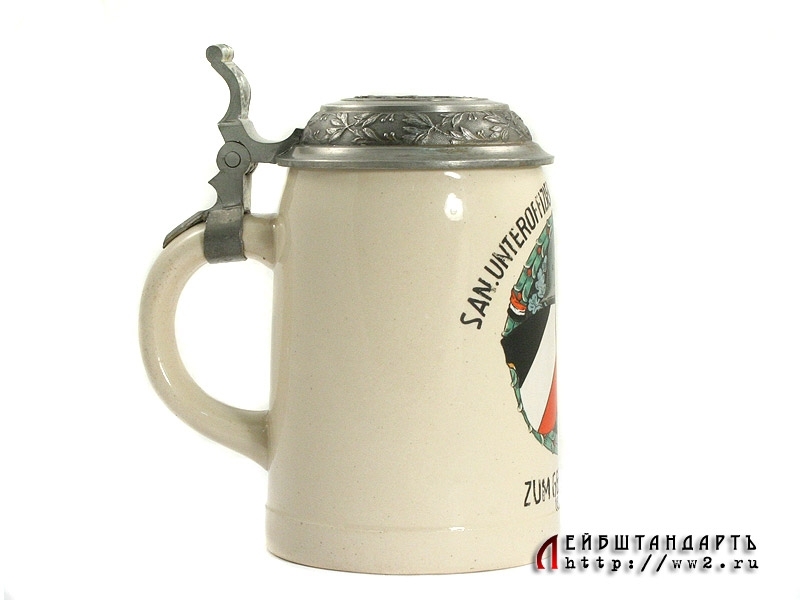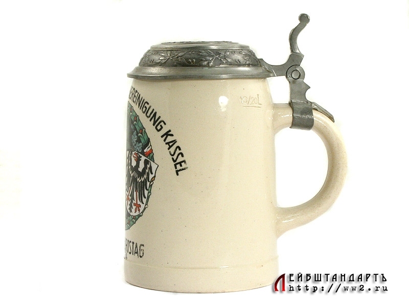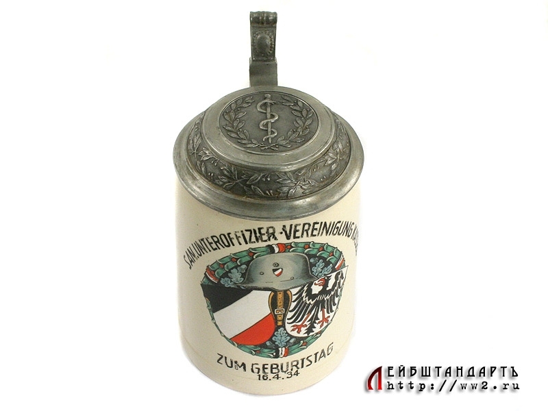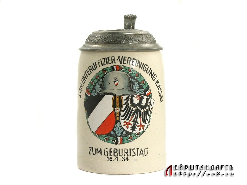 Памятная фаянсовая пивная кружка - подарок к Дню рождения, датированная 16 апреля 1934 года. Крышка откидная оловянная, предмет в очень хорошей сохранности, без сколов и трещин.