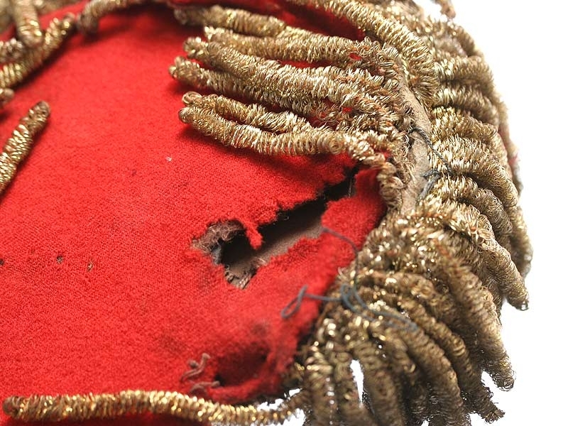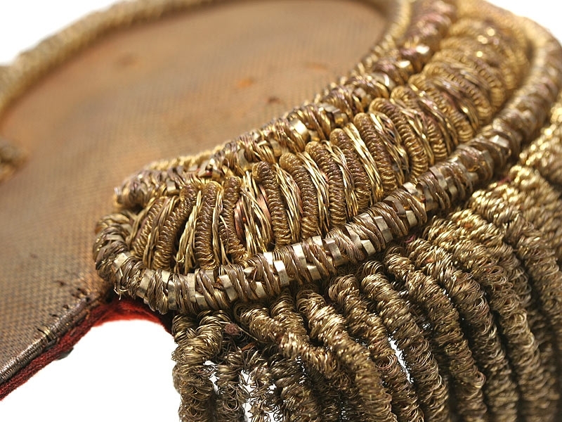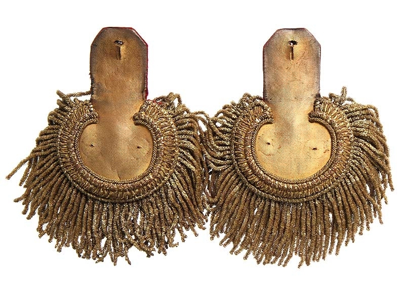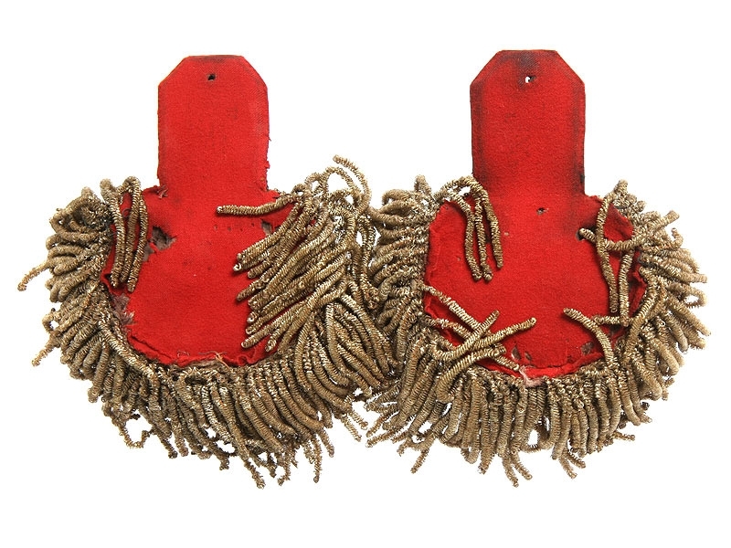Эполеты полковника гвардии, начало ХХ века. Верх из металлизированной золоченой нити, с бахромой. На алом суконном подбое. Очень хорошее состояние.