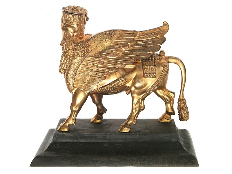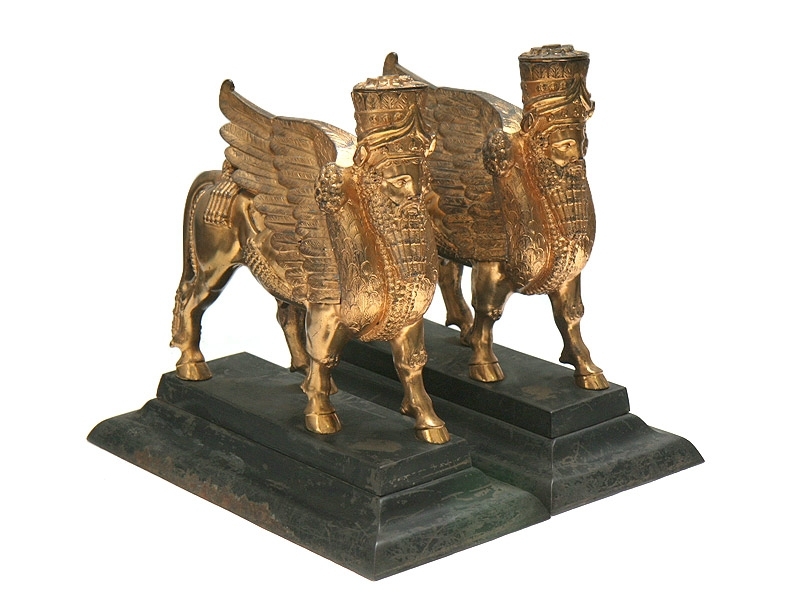 Парные настольные статуэтки - скульптуры в виде крылатых быков с человеческими головами, изготовленные по мотивам образцов древнего ассирийского искусства. Обе статуэтки практически полностью повторяют друг друга, достаточно тонко проработаны и покрыты поталью под позолоту. На прямоугольных массивных бронзовых основаниях, выкрашенных в черный цвет. На каждой скульптуре имеется клеймо мастерской. Очень хорошее состояние.