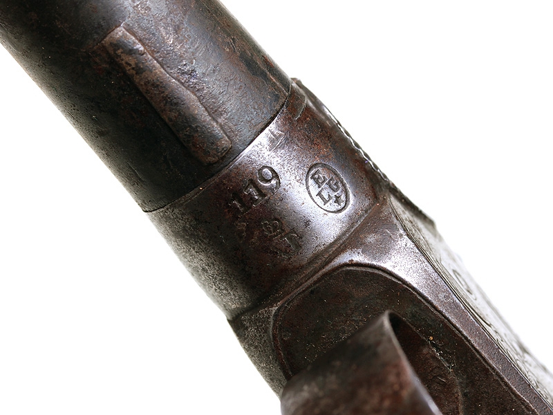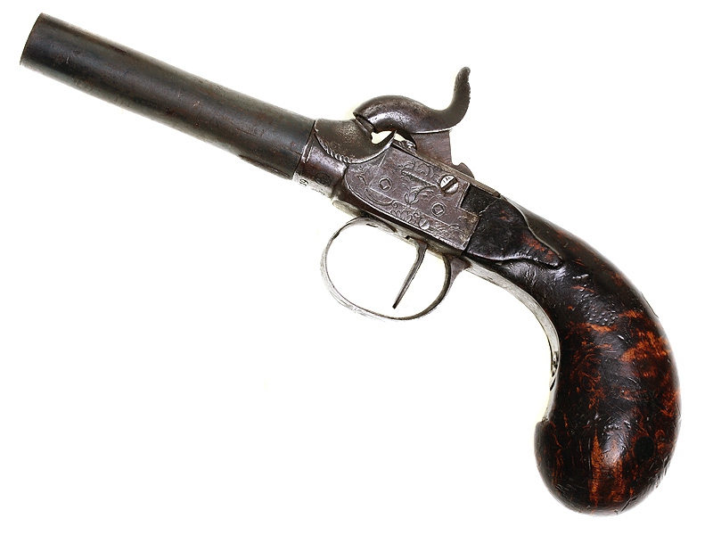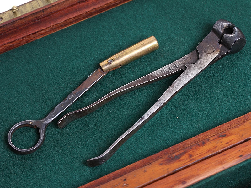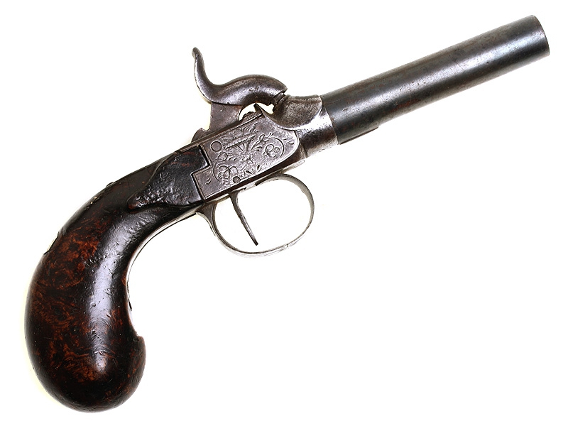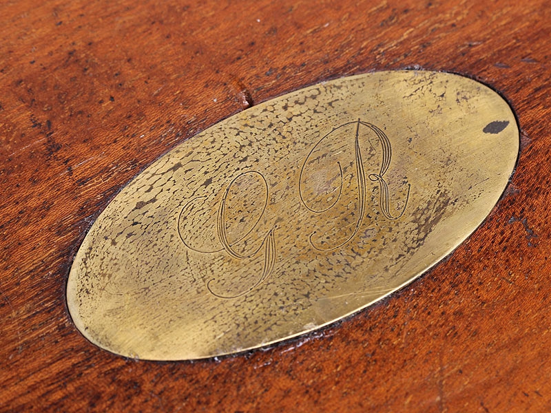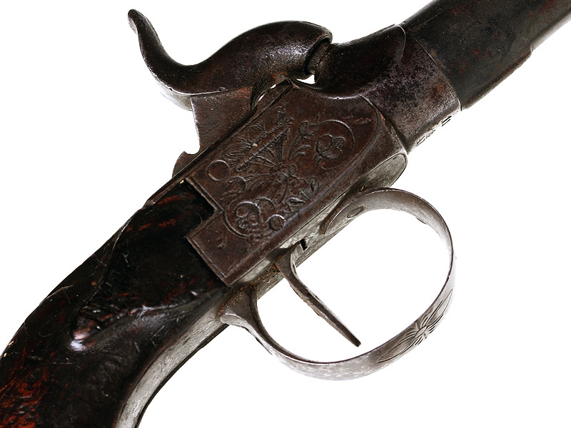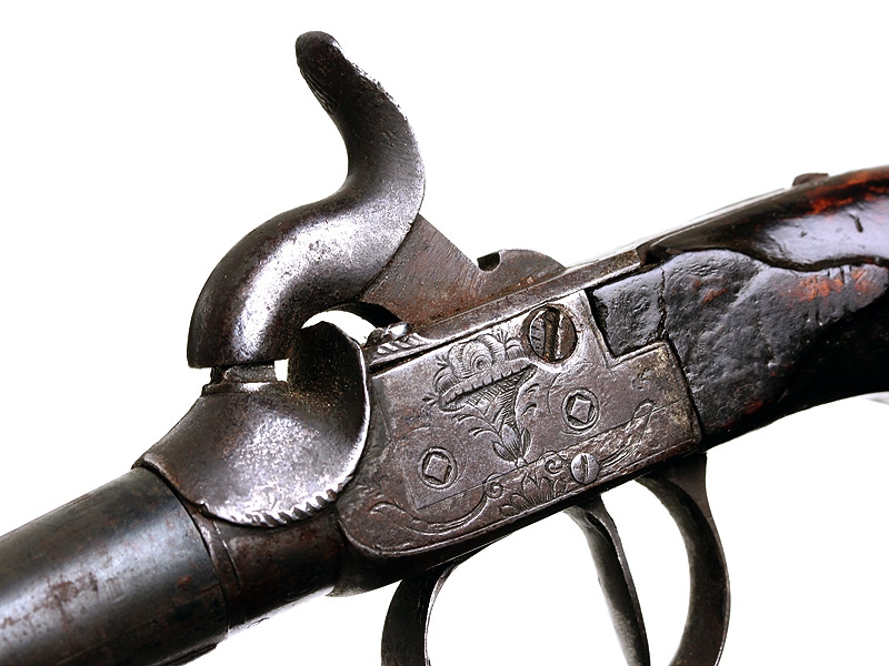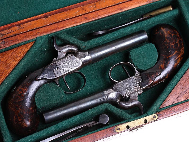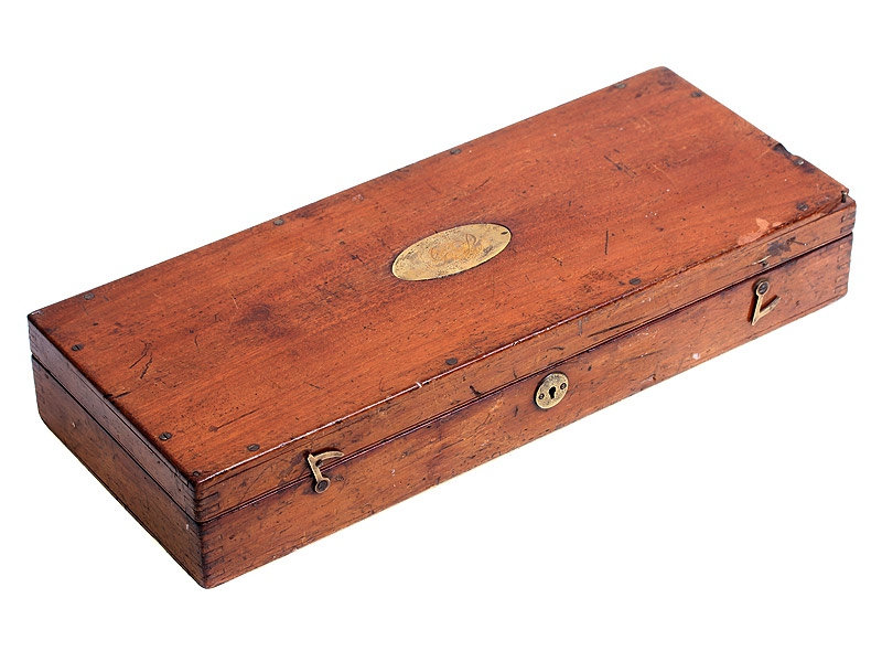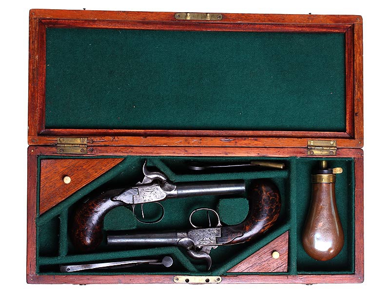 Пара дорожных пистолетов с капсюльными замками середины XIX века. Вороненые стволы отвинчиваются (это сделано для удобства при чистке оружия), рамы украшены гравированным орнаментом. Имеются клейма приемки в Льеже, на обоих пистолетах - номер "119" и поверочные клейма. В спинку деревянных рукояток врезаны миниатюрные посеребренные таблички для монограммы владельца, оставшиеся незаполненными. Пистолеты в хорошей сохранности, замки исправны, имеются незначительные следы от долгого хранения и эксплуатации. Хорошо сохранился деревянный футляр, разделенный внутри на отсеки для хранения пистолетов и необходимых аксессуаров: из них сохранились медная пороховница и пулелейка. В отсеке для пуль сохранилась единственная свинцовая сферическая пуля. На крышке футляра - овальный латунный диск с монограммой владельца "GR".