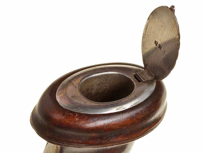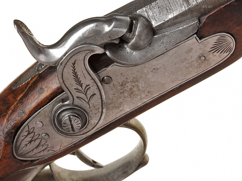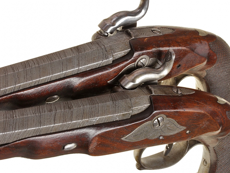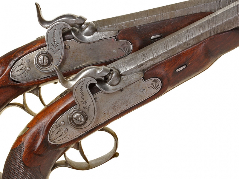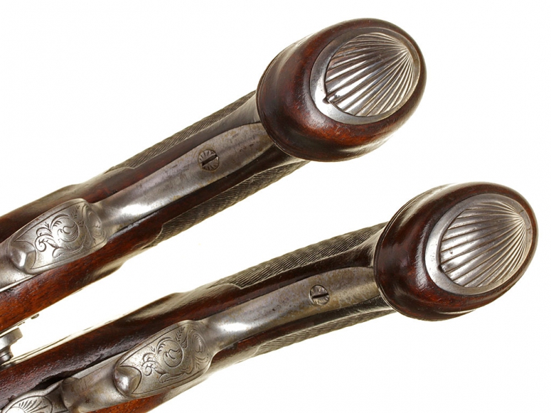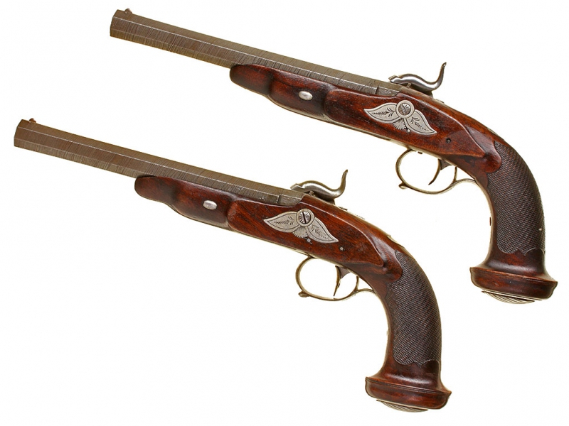 Пара классических дорожных пистолетов с капсульными замками, изготовленных во второй трети XIX века. Нарезные восьмигранные дамаскированные стволы слегка расширяются к дульному срезу, мушка нерегулируемая. На одной из граней ствола имеется клеймо арсенала в Льеже. Замок каждого пистолета украшен гравированным орнаментом, при этом замки не подписаны мастером. Скобы с курками, а также ответные части замков также украшены художественной гравировкой. Деревянная рукоять каждого пистолета покрыта мелким рифлением для удобства удержания оружия в руке, а внизу имеет расширение - украшенное по бортику резным орнаментом. Стальные накладки в основании рукоятей имеют откидные крышки, декорированные в виде створки ракушки: внутри каждой рукояти имеется пенал для хранения капсюлей и пуль. Замки полностью исправны.