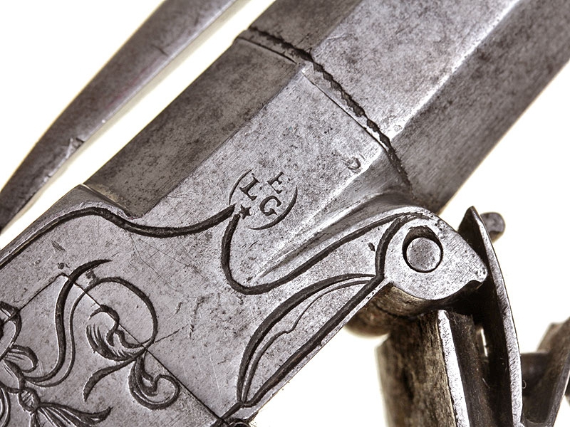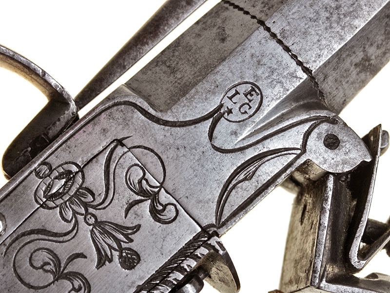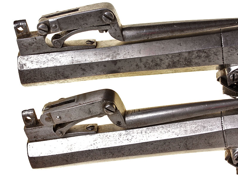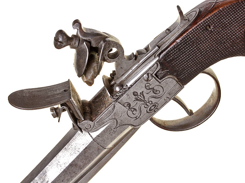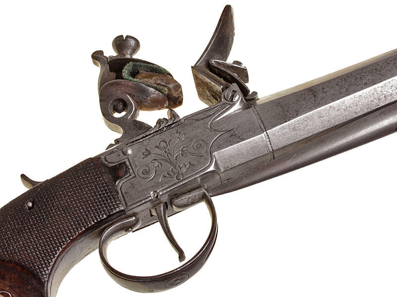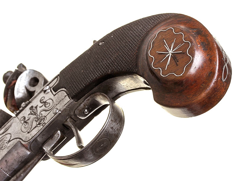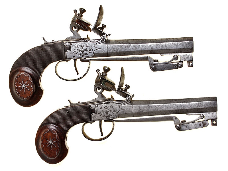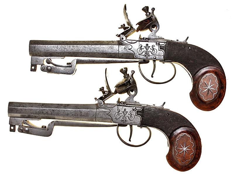 Пара миниатюрных дорожных пистолетов с кремневыми замками, изготовленных в первой трети XIX века. Стволы граненые, с клеймом арсенала в Льеже. Замок каждого пистолета украшен гравированным орнаментом. Скобы также украшены гравировкой, каждый курок имеет предохранитель, сохранились даже кремни в замках. Деревянная рукоять каждого пистолета покрыта мелким рифлением для удобства удержания оружия в руке, а также украшена инкрустацией серебряной проволокой. Если отвести скобу слегка назад, раскладывается подпружиненный штык, расположенный под стволом, что превращает однозарядный пистолет в холодное оружие ближнего боя. Отличное состояние, замки исправны, предметы в сохранности, присущей домашнему хранению.