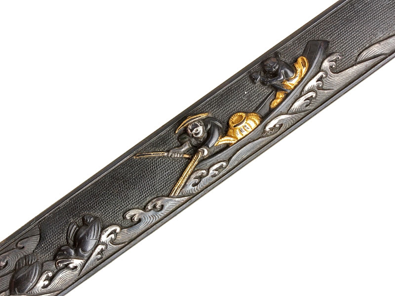 Вакидзаси имеет клинок без долов и подпись мастера на хвостовике клинка. Хвостовик имеет одно крепежное отверстие. Цуба и элементы рукояти декорированы в едином стиле с оправой катаны. В специальном кармашке ножен - ножик кодзука с изображением рыбаков на рукояти и подписанным клинком. Также имеются сира-сайя для хранения клинка.