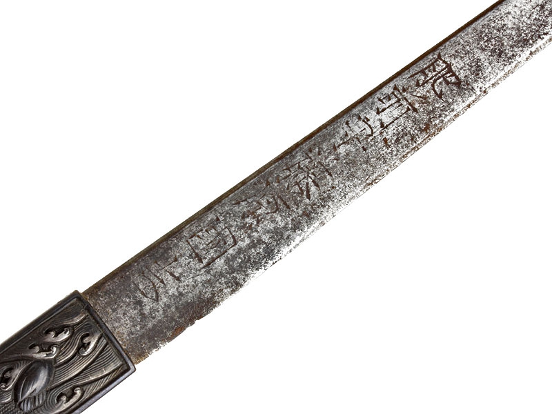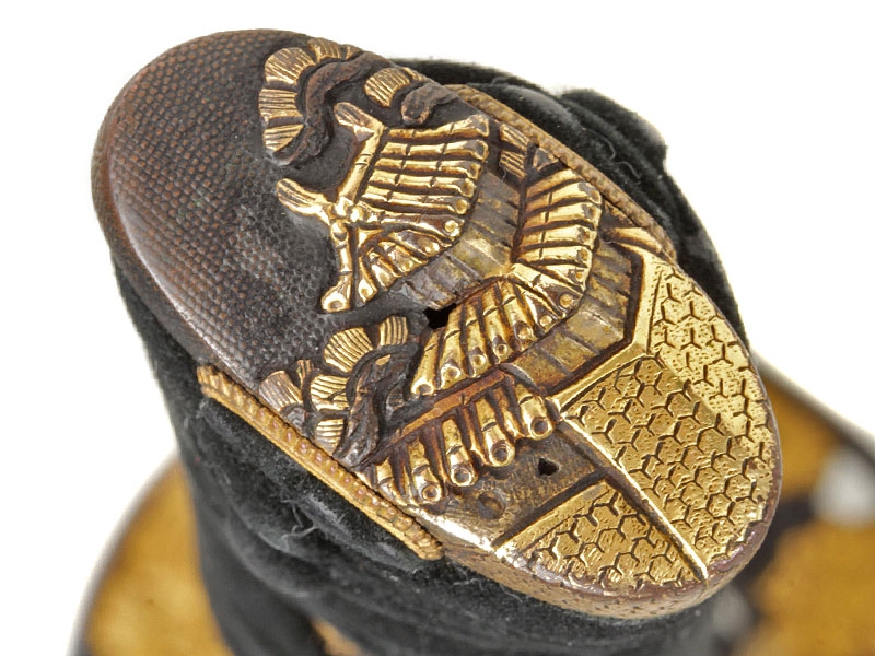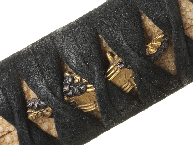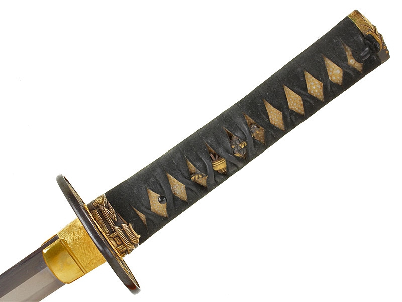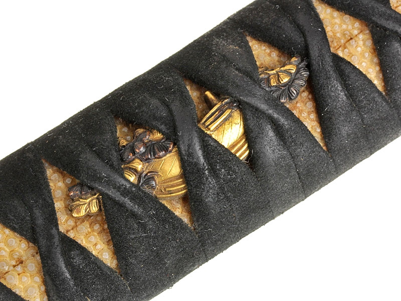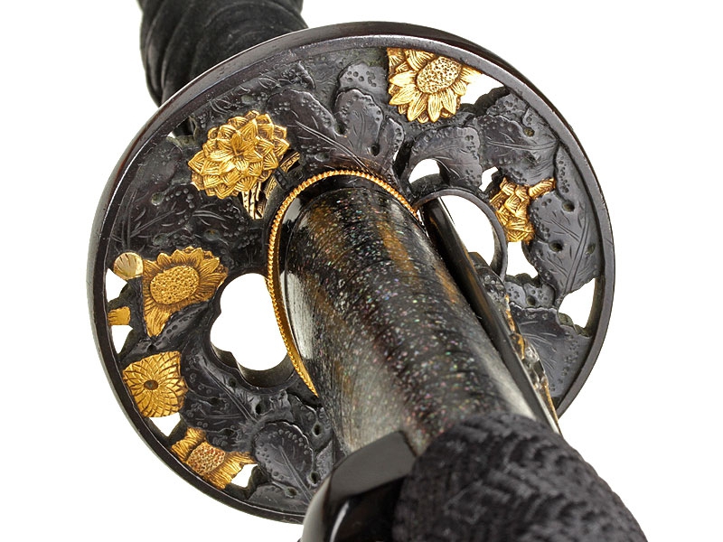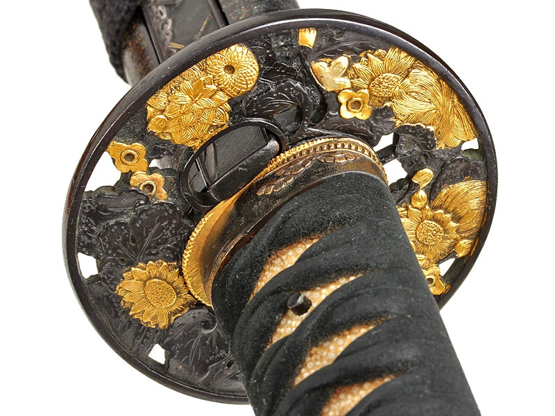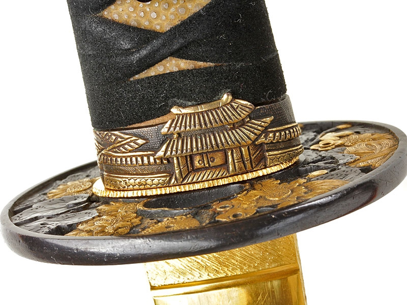 Катана имеет неширокий клинок с одним узким долом и четко видимой слегка волнистой линией закалки (хамон сугу-ха). Хвостовик не подписан мастером (му-мэй) и имеет четыре крепежных отверстия, одно из которых закрыто медной заклепкой - меч служил долго и многократно перемонтировался в новую оправу. Цуба из патинированной в черный цвет бронзы, с позолоченными изображениями цветов и нераспустившихся бутонов. Рукоять исполнена в традиционной для японского меча технике. Фути и касира парные, украшены позолоченными изображениями храмовых построек. Ножны покрыты черным лаком с добавлением перламутровой крошки, что придает мечу очень нарядный вид. Имеются сира-сайя для хранения клинка.