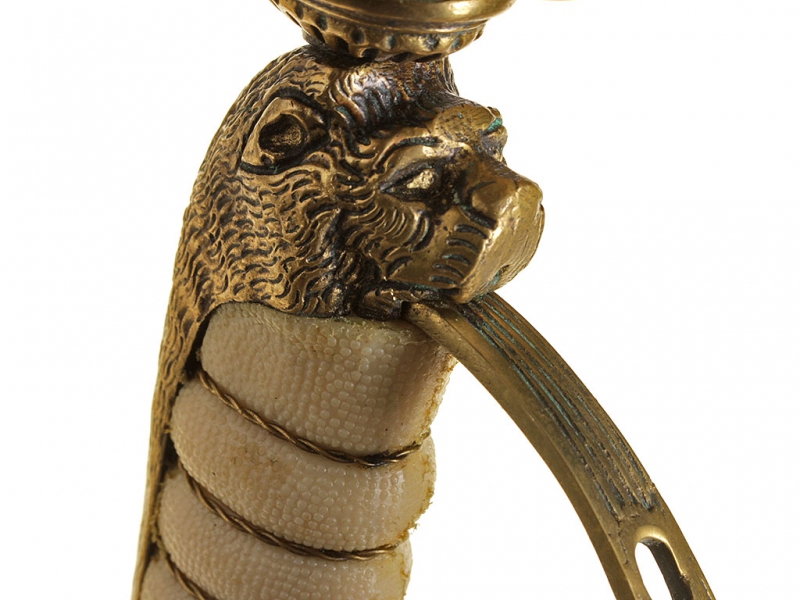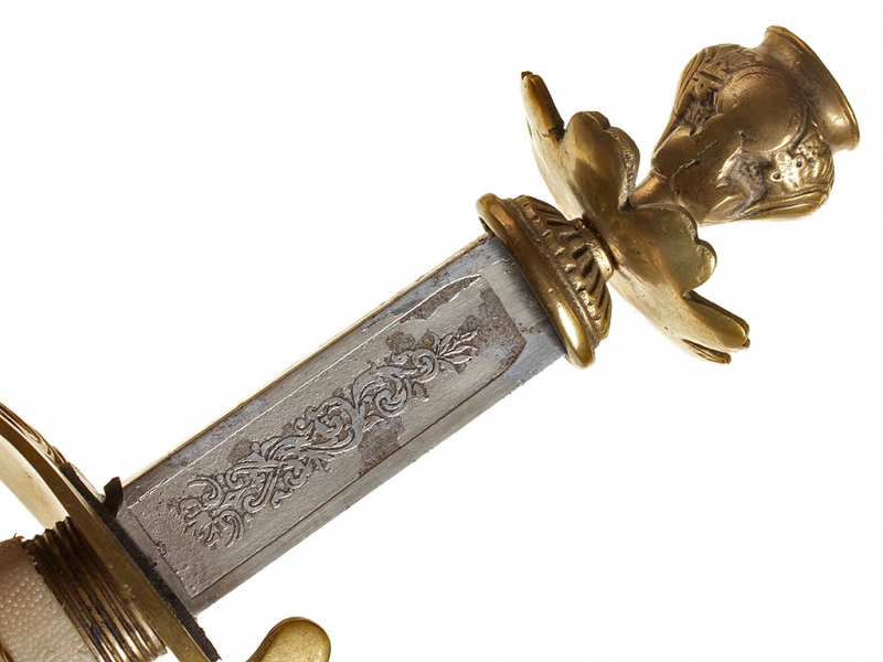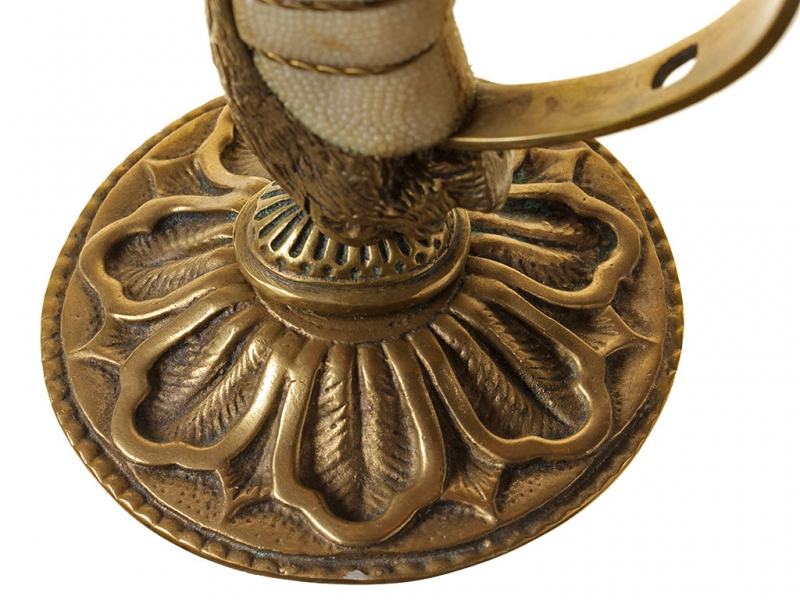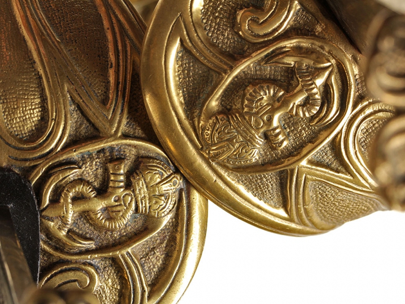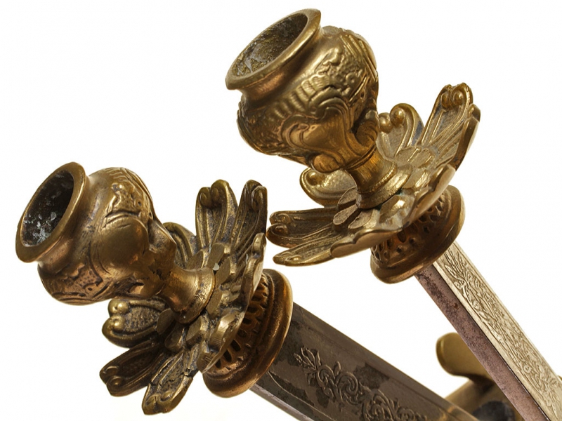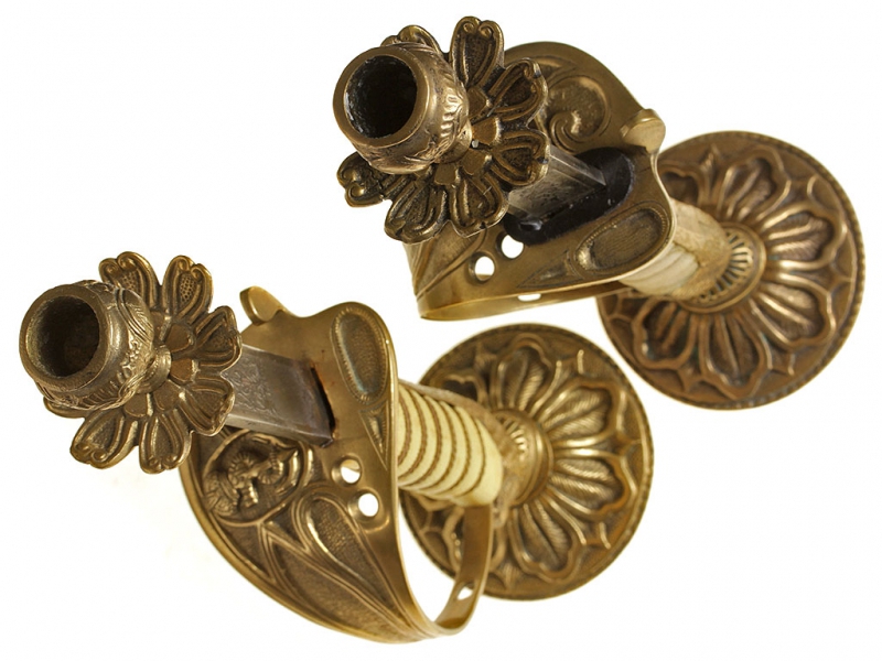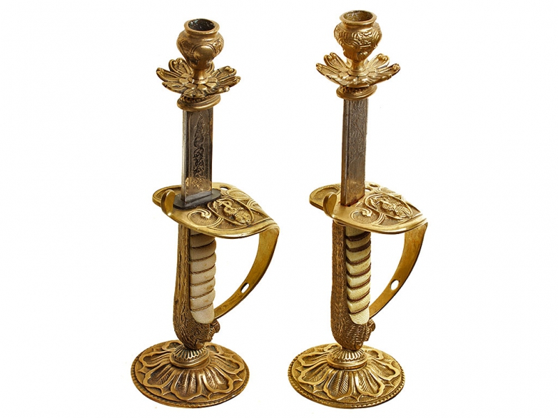 Пара подсвечников, изготовленных из двух украшенных эфесов английских морских офицерских сабель образца 1827 года. Клинки обрезаны, клейма изготовителя не сохранились. Прибор эфесов изготовлен из золоченой бронзы. Подставки и чашки подсвечников также изготовлены из бронзы.