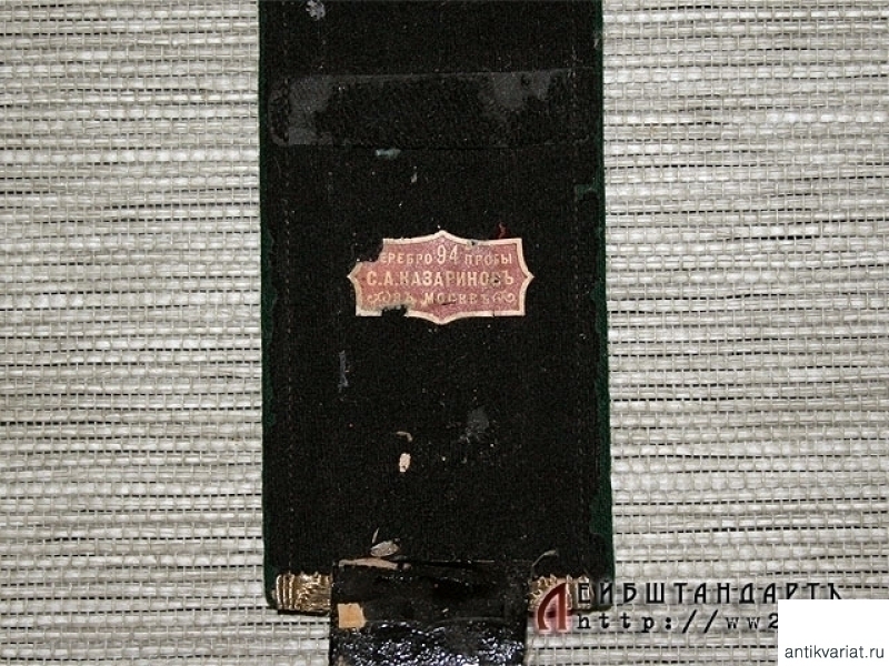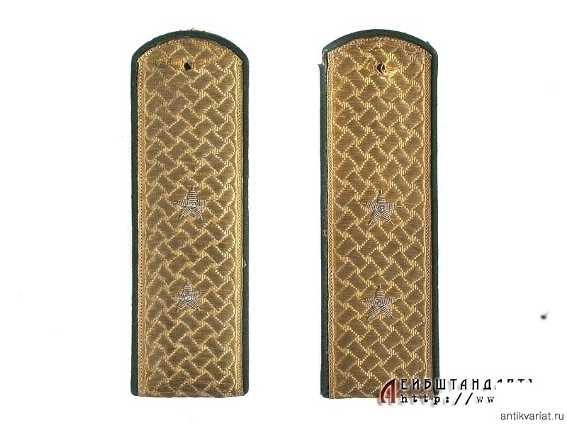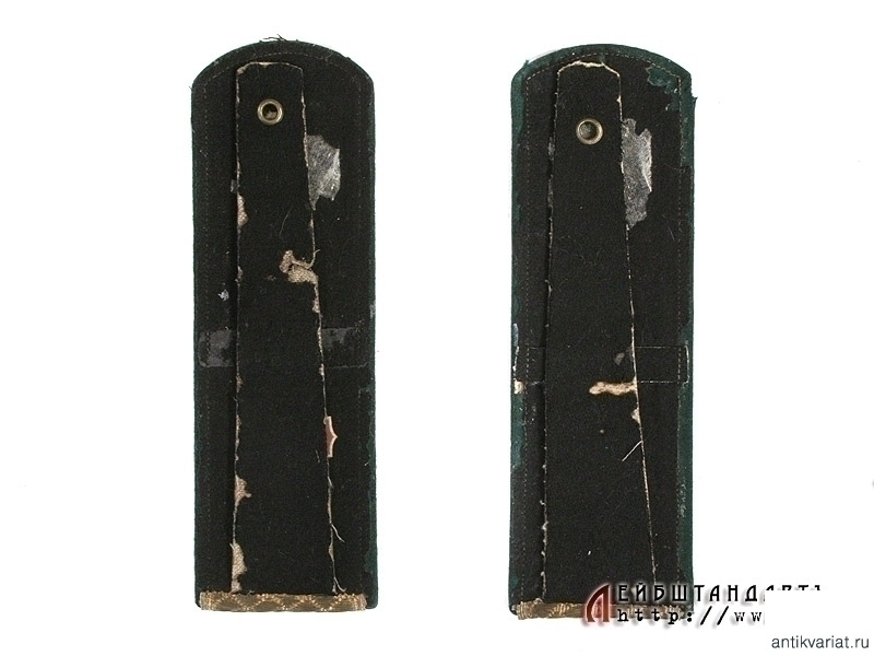 Пара погон чиновника 4 класса судебного ведомства, введенных в 1898 году. Согласно своему рангу этот чиновник примерно соответствовал бы, на сегодняшний момент, прокурору района. На темно-зеленой суконной подложке шитые из позолоченной серебряной нити погоны, снабженные шитыми серебряными звездочками. Оборотная сторона черная суконная, с лямками. Под одной из них сохранилась бирка изготовителя: "Серебро 94 пробы. С.А.Казариновъ в Москве". Отличное состояние.