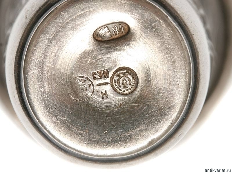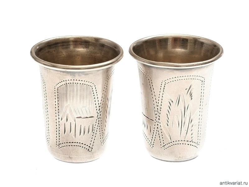 Пара миниатюрных серебряных рюмок емкостью около 30 грамм, украшенных штихельной гравировкой. Изнутри сохранилось оригинальное золочение. На донышках - пробирные клейма "84" и клейма мастерской.