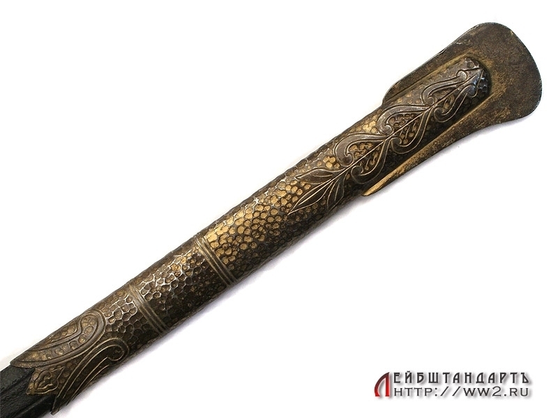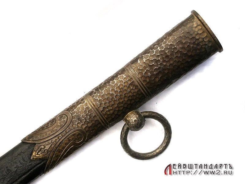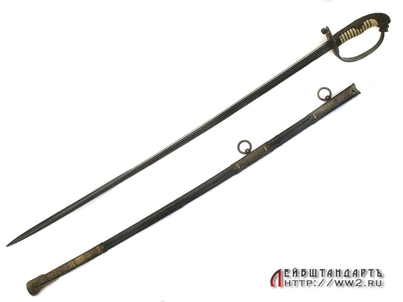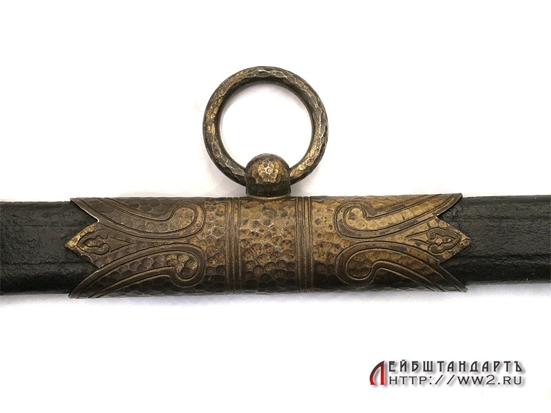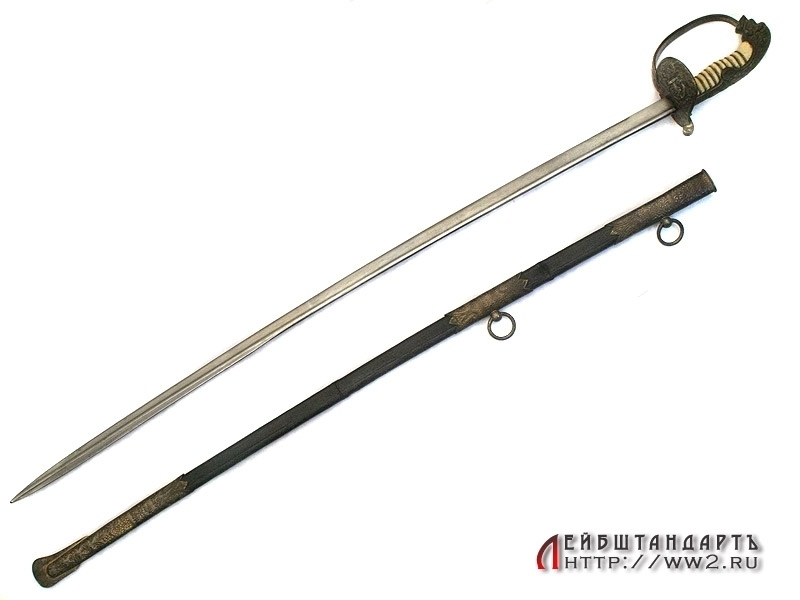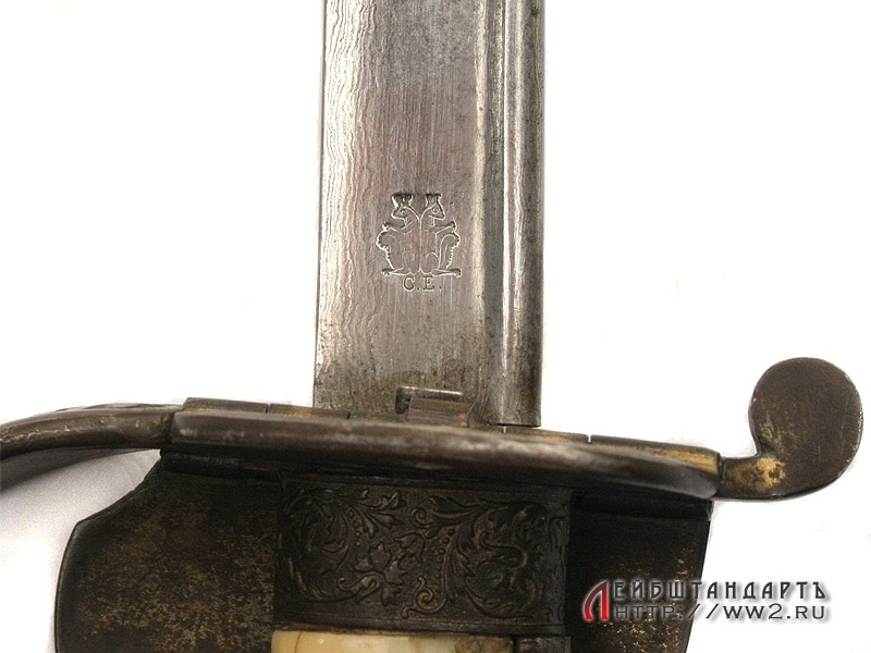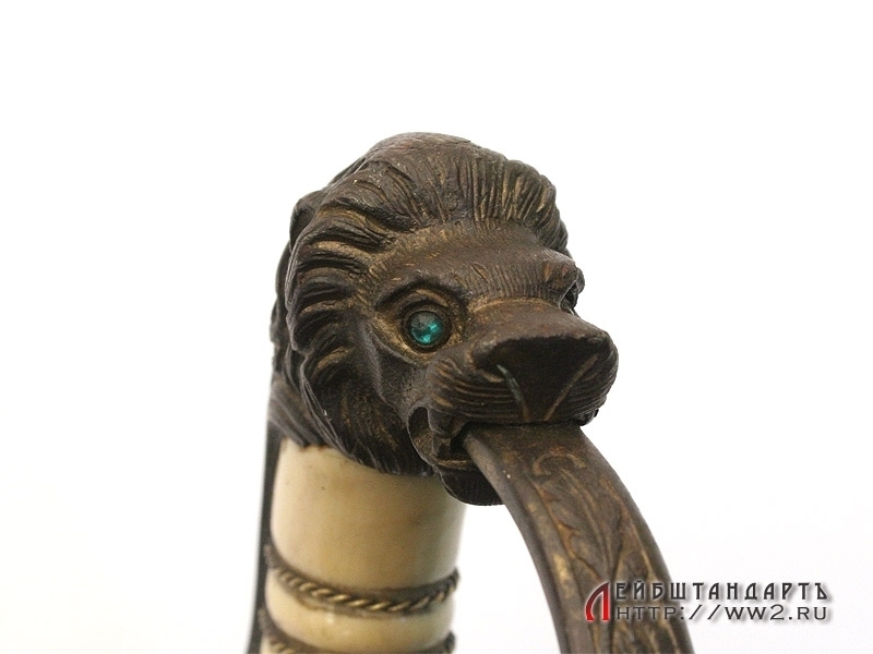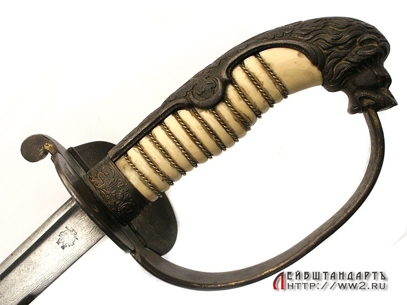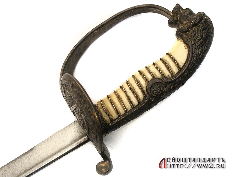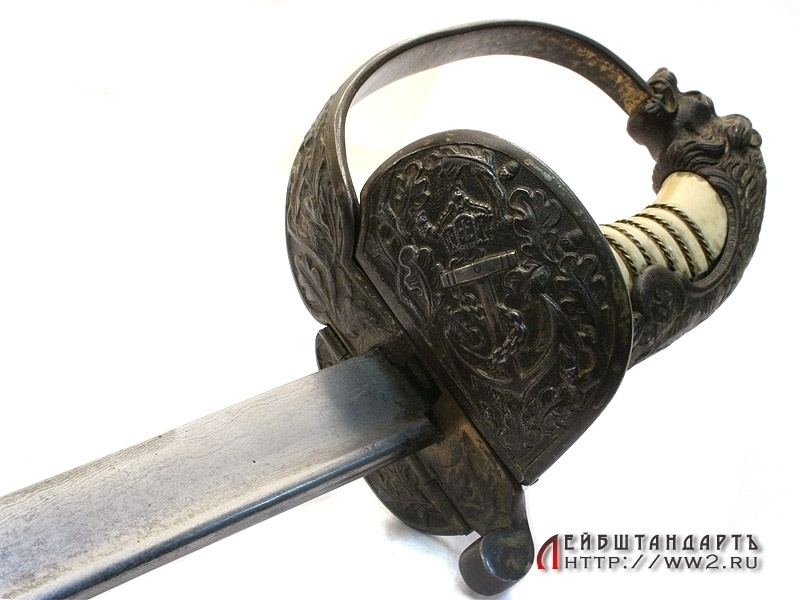 Парадная сабля офицера военно-морского флота времен Первой мировой войны. Клинок дамасской стали, с клеймом известной оружейной фирмы "Eickhorn" у основания. Рукоять изготовлена из слоновой кости и обтянута по желобкам витой проволокой, все металлические детали рукояти изготовлены из позолоченной бронзы. Все металлические части эфеса (и ножен) покрыты налетом красивой темной патины. Навершие изготовлено в виде львиной головы, в глаза которой вставлены ограненные камни: красный и зеленый - это цвета сигнальных фонарей на носу и корме корабля. Обе половинки гарды складные, что сделано для удобства при ношении. Лицевая сторона украшена тщательно проработанным изображением якоря под кайзеровской короной. Ножны кожаные черные, с золочеными устьем, гайкой и наконечником, покрытыми характерным "ямочным" орнаментом - даже кольца для подвешивания к портупее украшены в той же манере. Устье снабжено шпеньком - фиксатором, удерживающим саблю в ножнах. Единственный недостаток - кожаные ножны сломаны, по всей видимости давно: возможно восстановить.