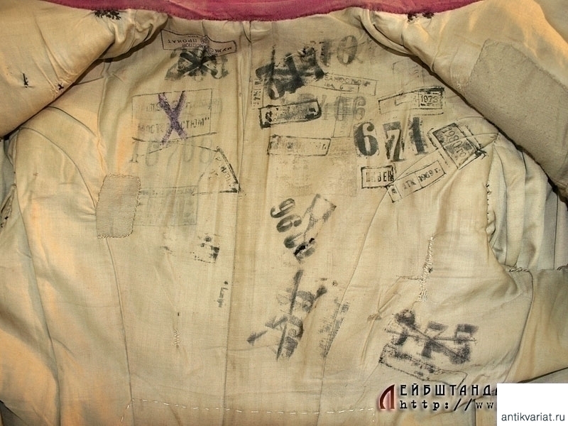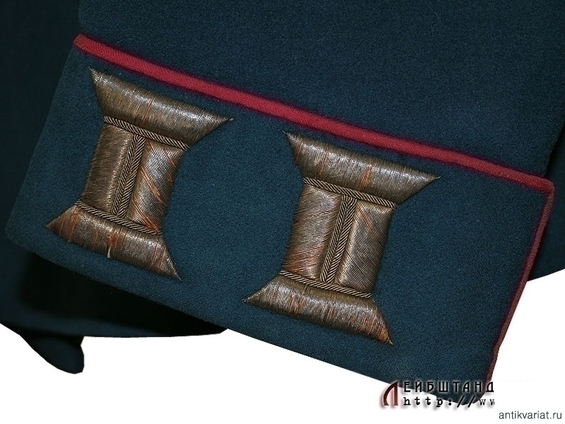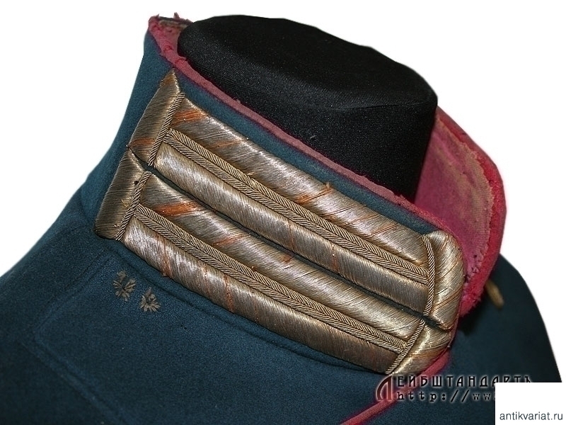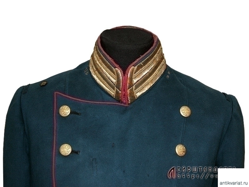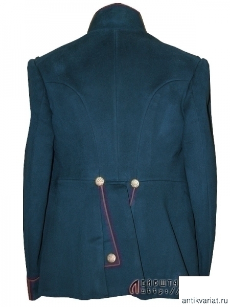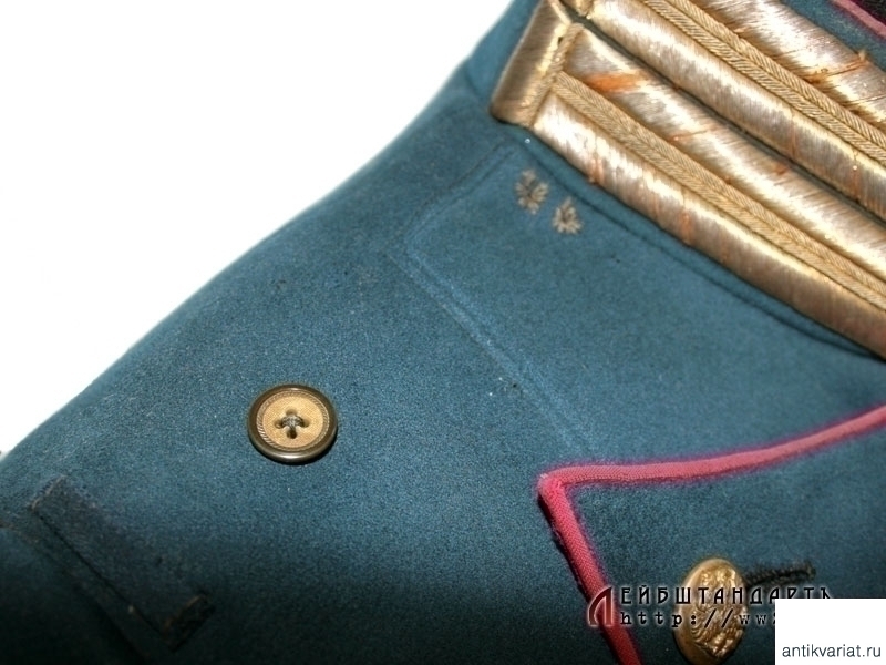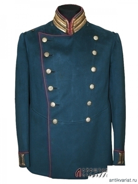 Парадный мундир обер-штаб-офицеров армейских и стрелковых полков образца 1909 года. Мундир из сукна темно-лазурного цвета, шитье воротника и катушек - из позолоченной серебряной нити. Китель двубортный, с двумя рядами позолоченных пуговиц, на которых помещены накладные двуглавые орлы. На груди находится вшитая петля для крепления креста либо медали. Пуговица, пришитая под правым погоном, предназначалась для пристежки аксельбанта - такой китель мог носить только адъютант. Предмет в очень хорошей сохранности, большого размера. На подкладке присутствует большое количество театральных клейм, что не может быть отнесено к недостаткам, а скорее служит подтверждением подлинности.