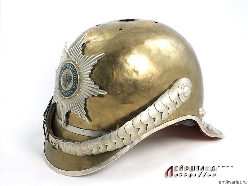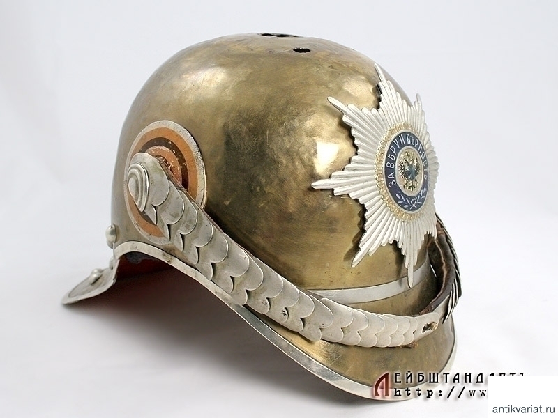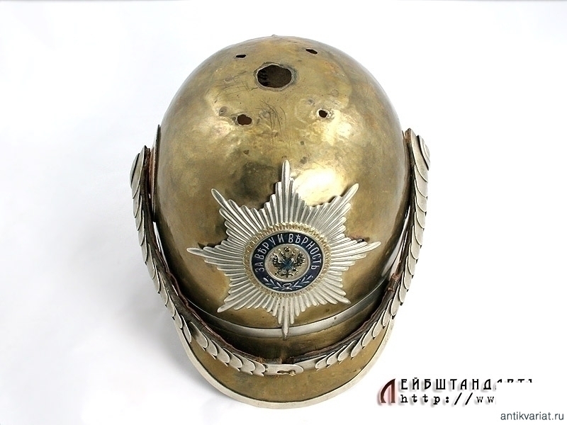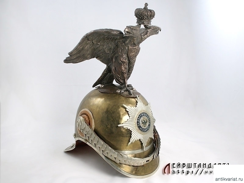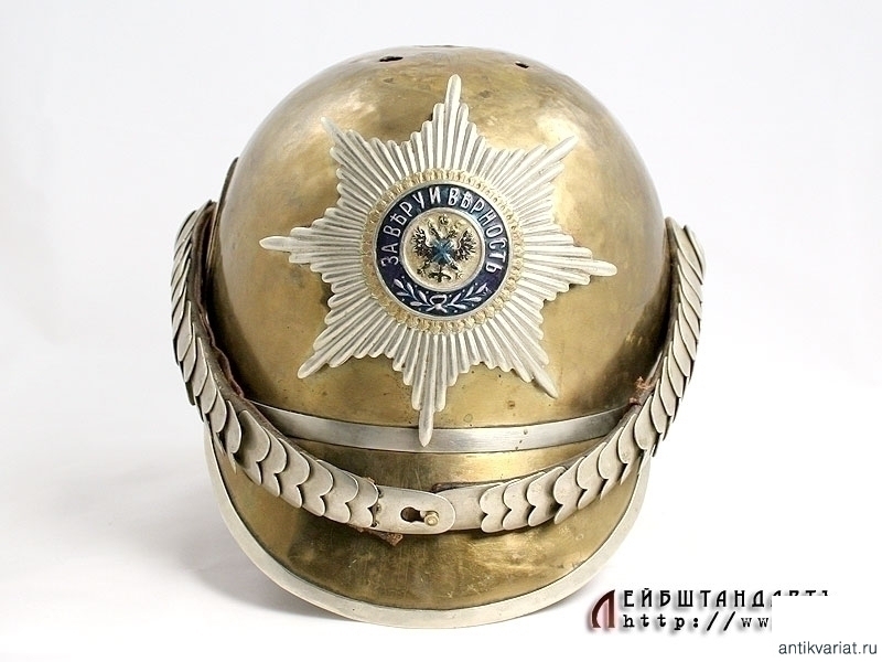 Чрезвычайно редкий парадный шлем нижних чинов Лейб-гвардии Кавалергардского либо Лейб-гвардии Кирасирского полка в очень хорошем состоянии. Латунная сфера с козырьком и наборным затыльником снабжена белым мельхиоровым прибором, присущим только двум этим полкам. Декоративные заклепки также мельхиоровые. Бело-оранжево-черная боковая кокарда нижних чинов в оригинальном красочном покрытии. На шлем установлена гвардейская звезда в превосходном состоянии и кожаный ремешок с белой двухфестонной наборной чешуей.
