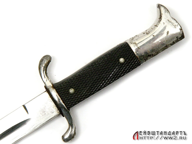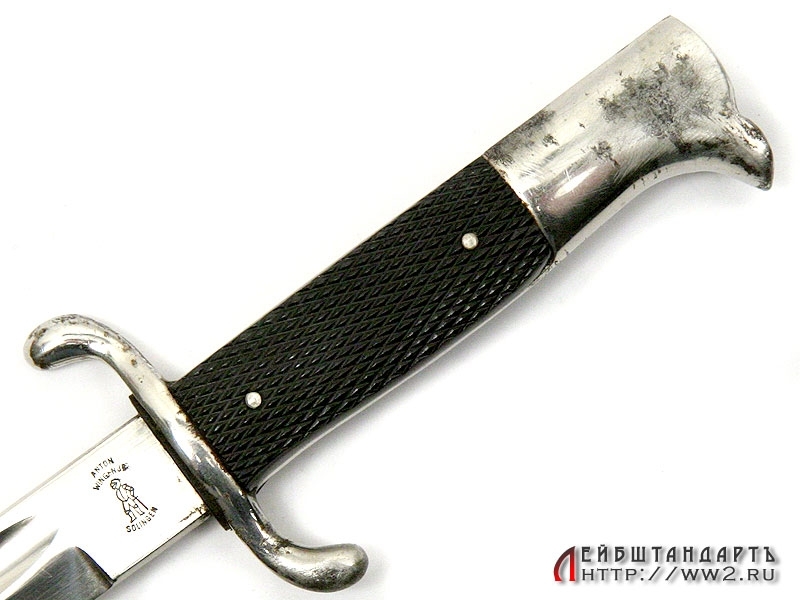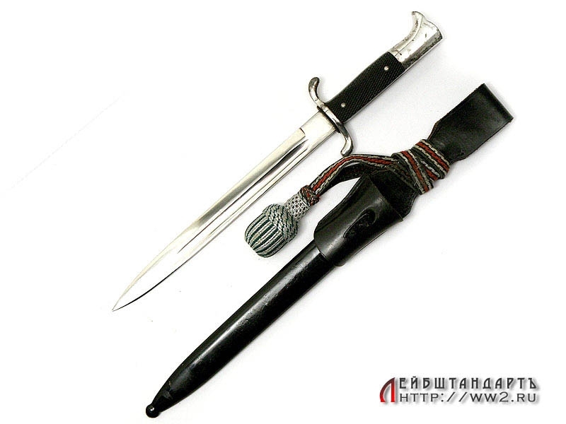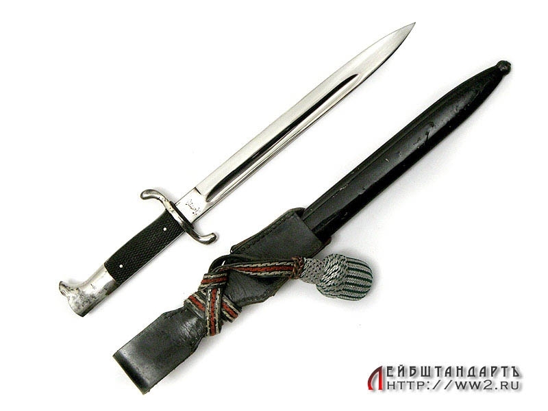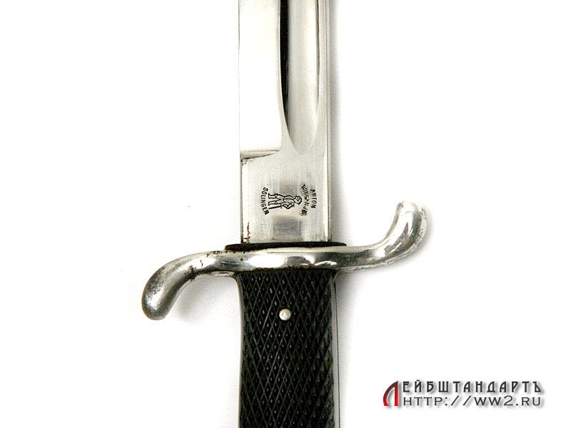 Парадный штык к винтовке Маузера в отличном коллекционном состоянии. Изготовлен фирмой "Anton Wingen JB" в Золингене, о чем свидетельствует соответствующее клеймо у основания клинка. Клинок никелированный. Элементы рукояти также никелированные, щечки изготовлены из рифленой черной пластмассы. Ножны металлические, выкрашенные в черный цвет. Красочное покрытие сохранилось практически полностью. К штыку прилагается оригинальный подвес из коричневой кожи и парадный темляк.