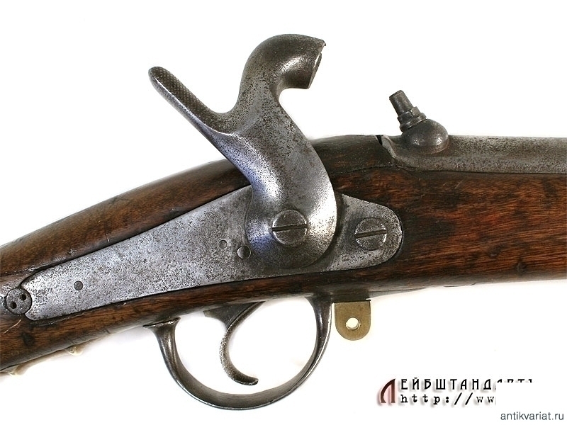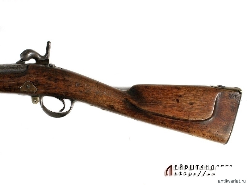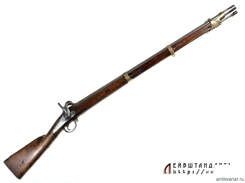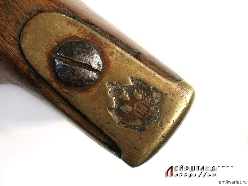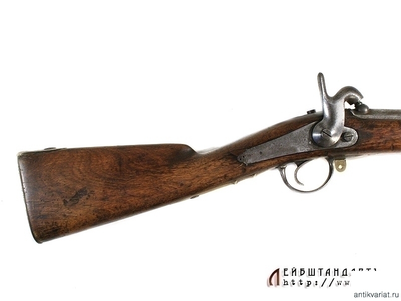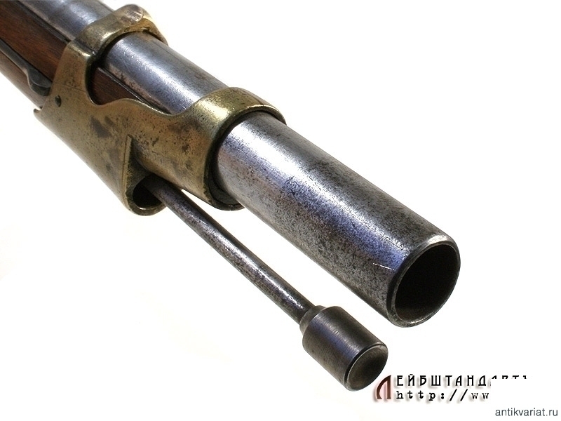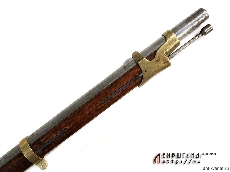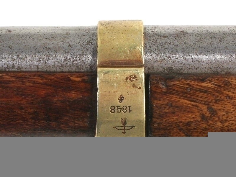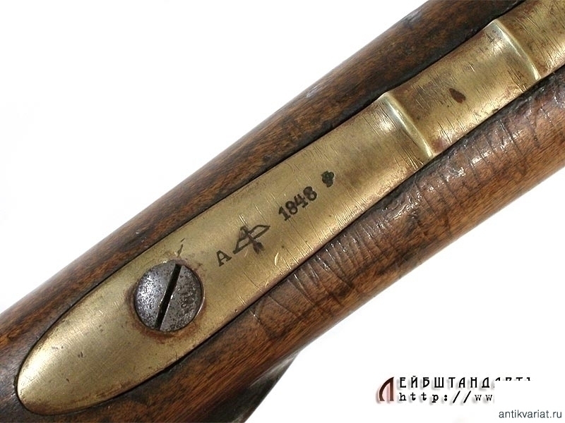 Пехотное армейское ружье в очень хорошем состоянии. У основания ствола находится полузатертый порядковый номер. Замок капсюльный, без клейм, рабочий. Деревянная ложа отлично сохранилась, на бронзовом затыльнике приклада имеется клеймо в виде двуглавого орла. На латунных крепежных кольцах помещены клйма с датой выпуска - 1848 год. Сохранился шомпол - предмет полностью комплектный.