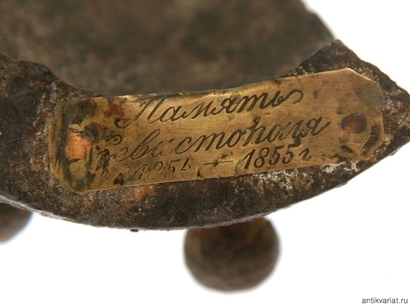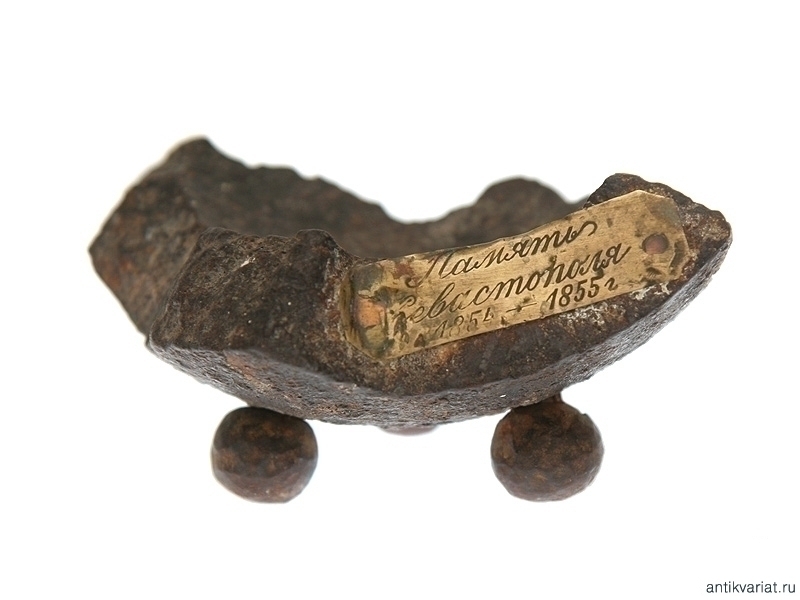 Пепельница, изготовленная из осколка ядра, размером 13 х 10,5 см. Памятный "солдатский" сувенир, изготовленный после завершения героической обороны Севастополя в 1854 - 1855 годах, о чем свидетельствует гравированная латунная табличка, приклепанная к боковой поверхности. Хорошее состояние.