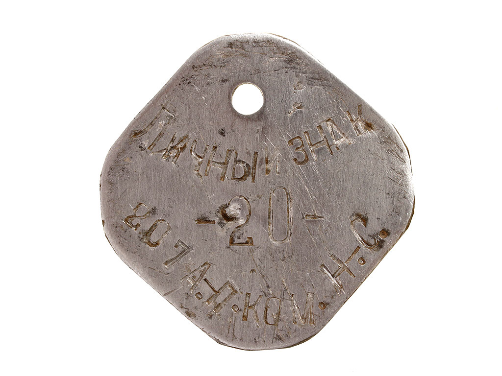 Личный опознавательный знак прямоугольной формы с номером "20", принадлежавший военнослужащему срочной службы 207 артиллерийского полка.