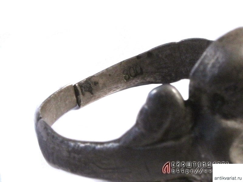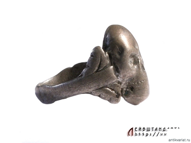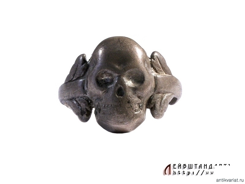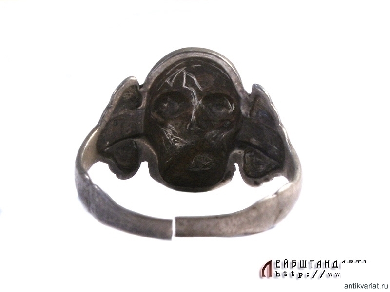 Серебряный перстень с изображением черепа, ободок кольца расширяющийся и плавно переходящий в дубовые листья, примыкающие к центральной части. На внутренней стороне клеймо - "800" проба, типичная для немецких ювелирных изделий. Перстни произвольных типов с изображением черепа были очень популярны в солдатской и офицерской фронтовой среде, символизируя мужество и презрение к смерти.
