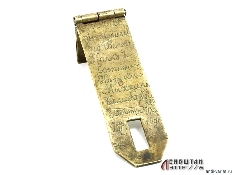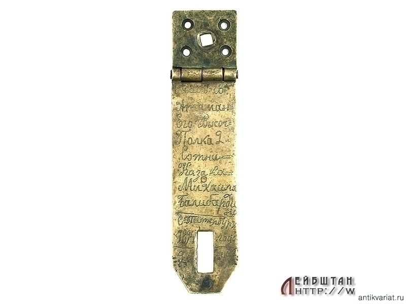 Латунная петля от солдатского сундука с нанесенными вручную данными владельца: "Лейбъ - Гв. Атаман. Его Высоч. полка 2-ой сотни казака Михаила Балибардина. С-Петербургъ, 1894 года 9 октября". Очень хорошее состояние.