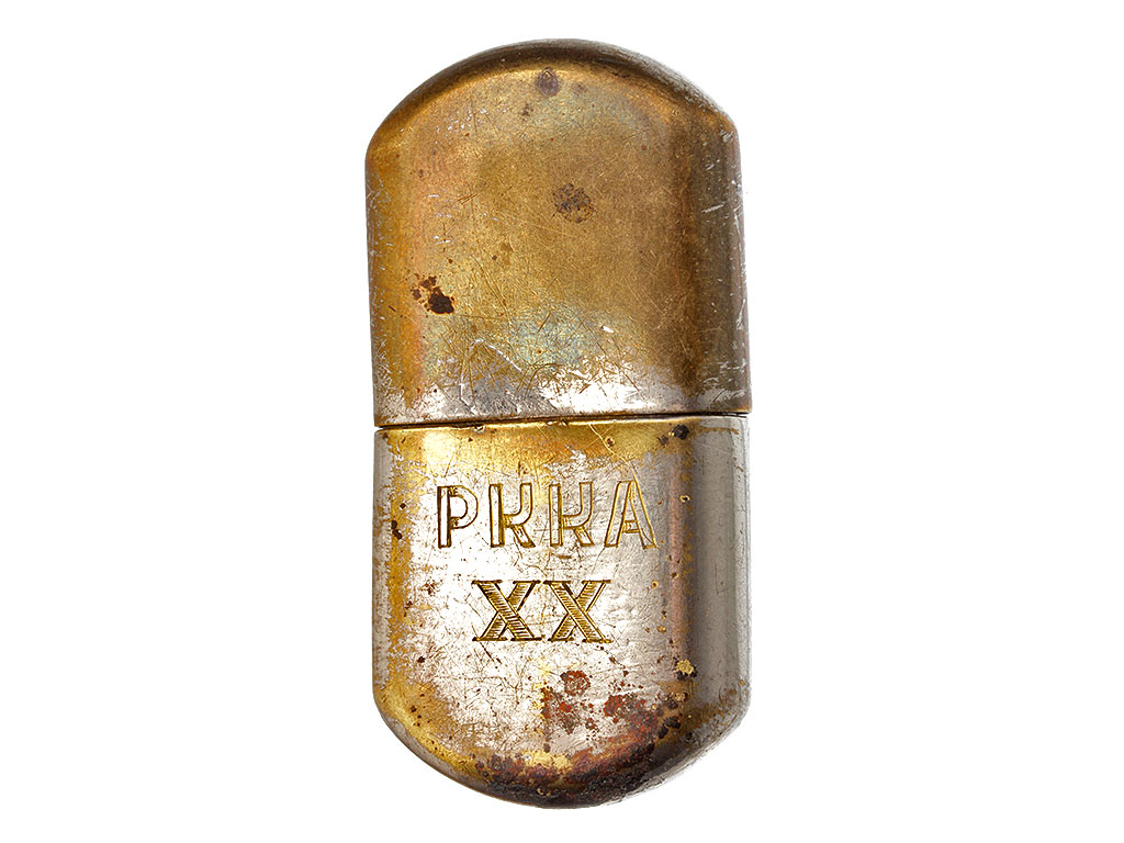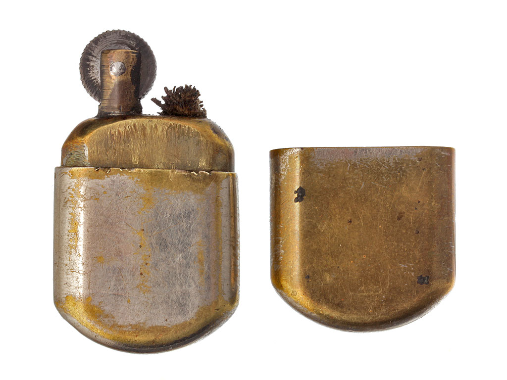 Карманная бензиновая зажигалка, изготовленная в конце 1930-х годов. Корпус изготовлен из никелированной латуни, на корпусе - гравировка "РККА ХХ". Колпачок съемный, механизм полностью исправен.