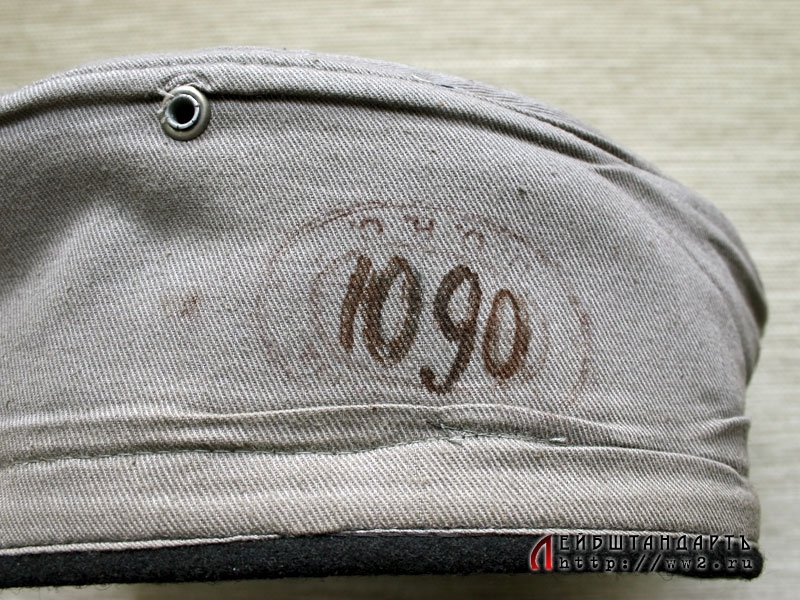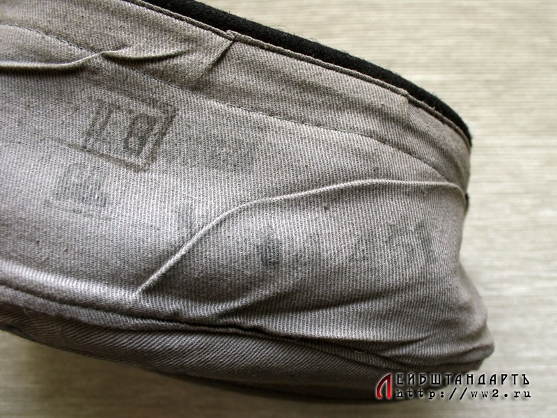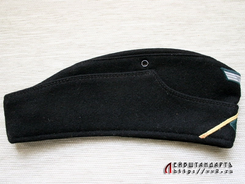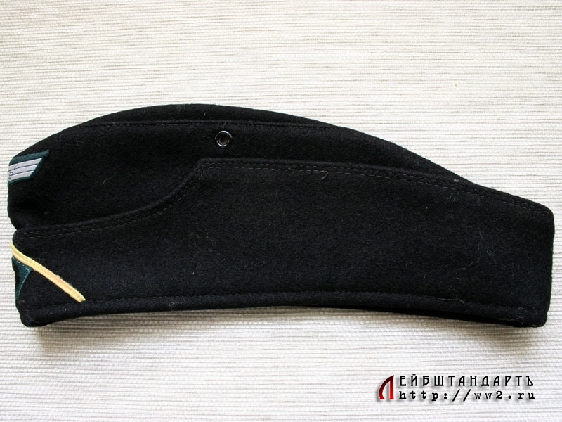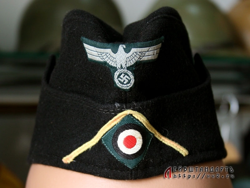 Сверх редкая чёрная пилотка бронетанковых частей связи Вермахта. Наличие лимонного-желтого сутажного треугольника на ней свидетельствует о принадлежности ее владельца к подразделению связи. Пилотка оригинально обшита знаками отличия, черный орел и трехцветная национальная кокарда изготовлены машинной вышивкой "BeVo". На подкладке имеются штампы изготовителя: "Lago - Berlin, Jahr 1941" и указание размера - 58. Еще один интересный штамп годности B.II.41 - означает, что пилотка предназначена для использования в повседневной и боевой обстановке, кроме парадов. Там же присутствуют чернильные театральные штампы (пилотка найдена в театральных вещах). По бокам пилотки находятся отверстия для вентиляции окрашеные чёрным лаком.