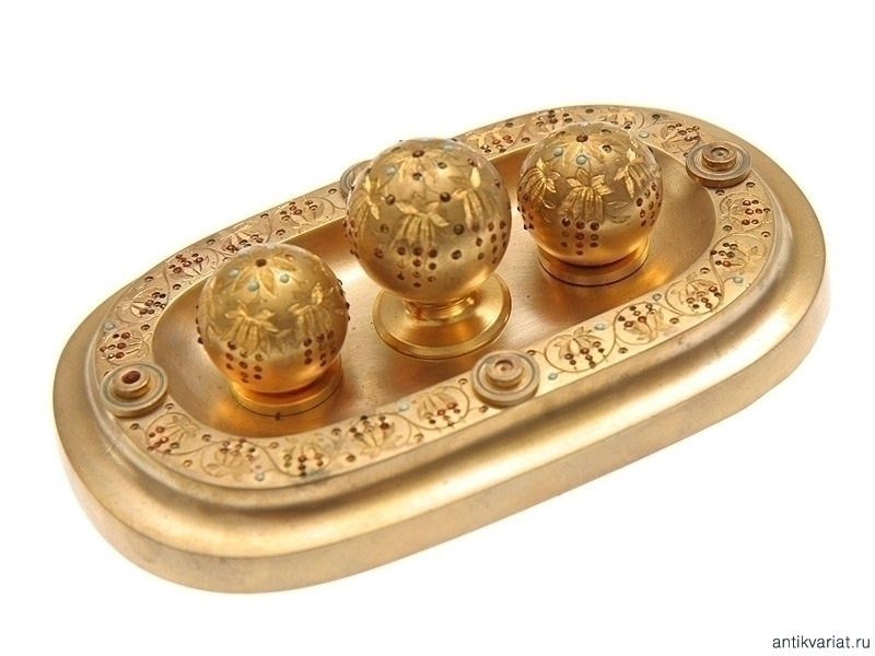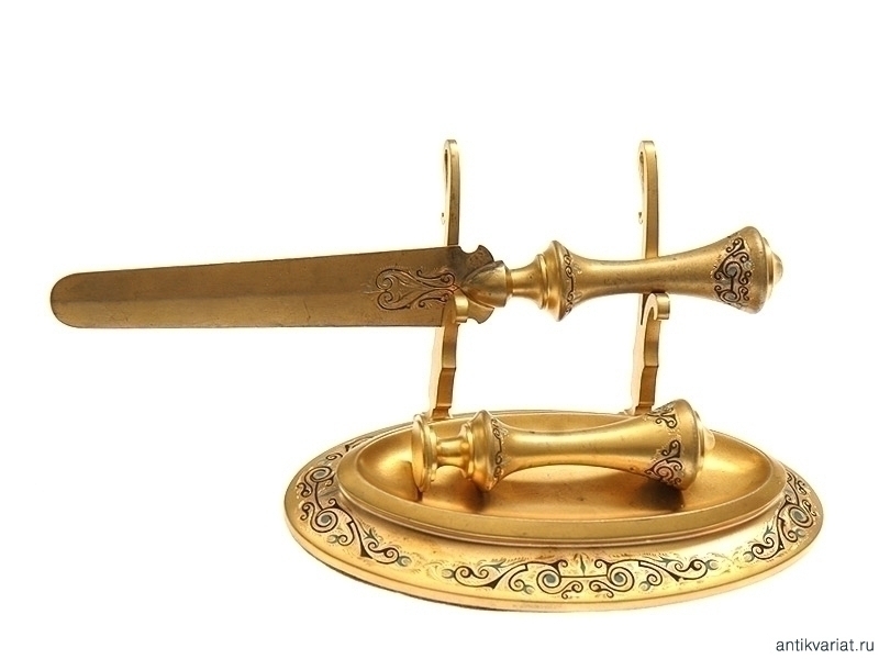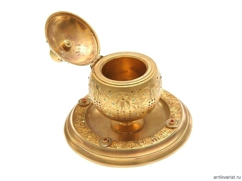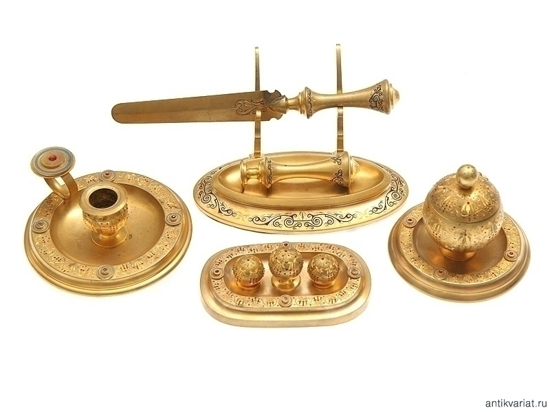 Настольный письменный прибор первой трети ХХ века. Включает в себя пресс для бумаг, держатель для пера, подсвечник, нож для бумаги и печать. Все предметы изготовлены из позолоченной бронзы, богато украшены гравировкой и вставками из цветных камней. Отличное состояние.