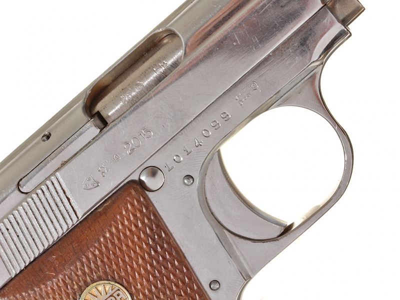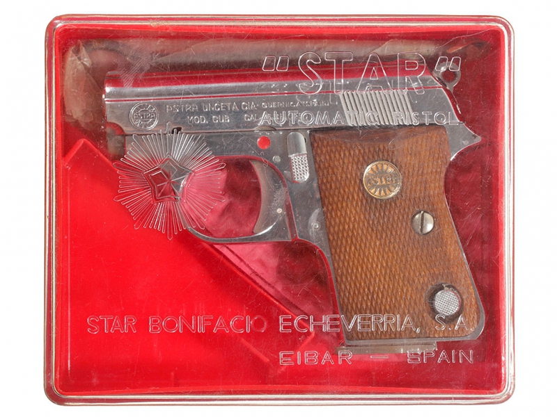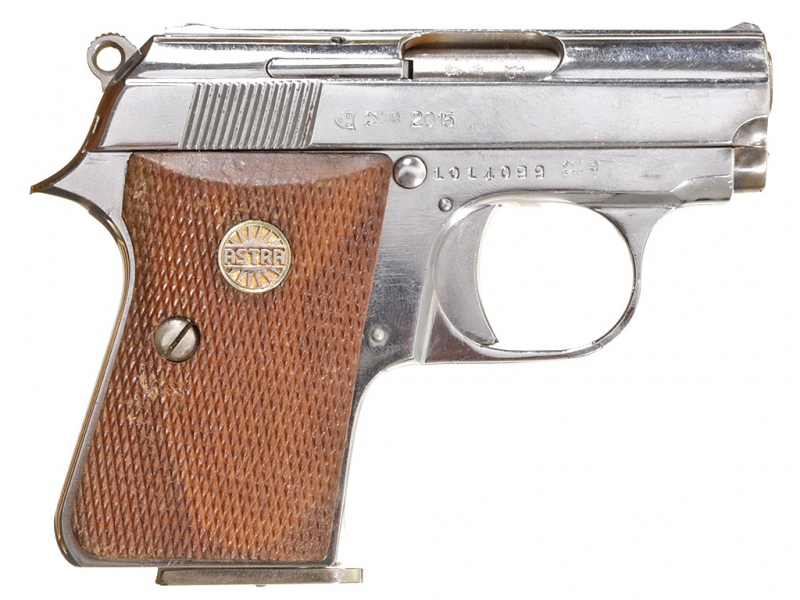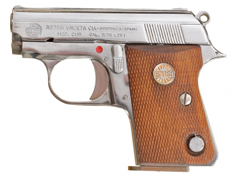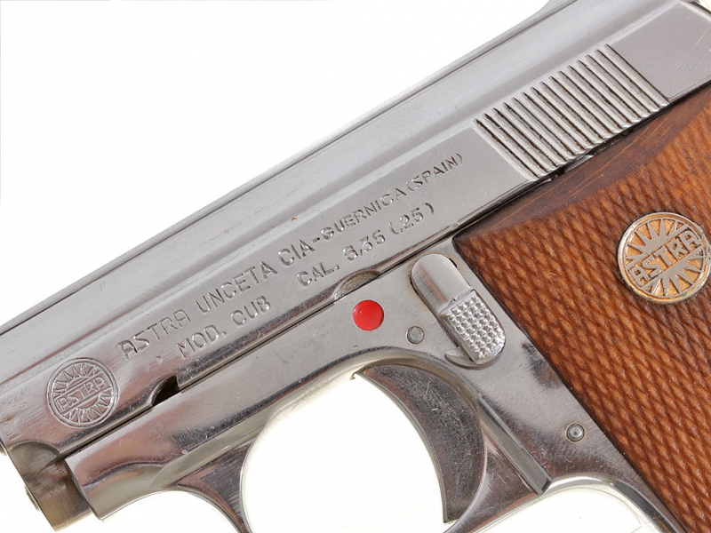 Небольшой карманный пистолет испанской фирмы Астра, модель "Каб" калибром "6,35". В никелированном варианте исполнения, в оригинальной фабричной коробке от пистолета "Star". Очень хорошее состояние.
