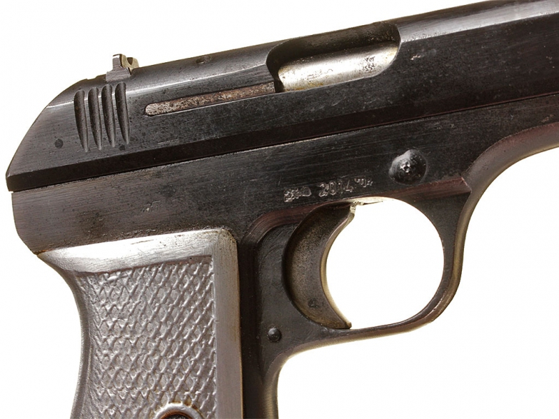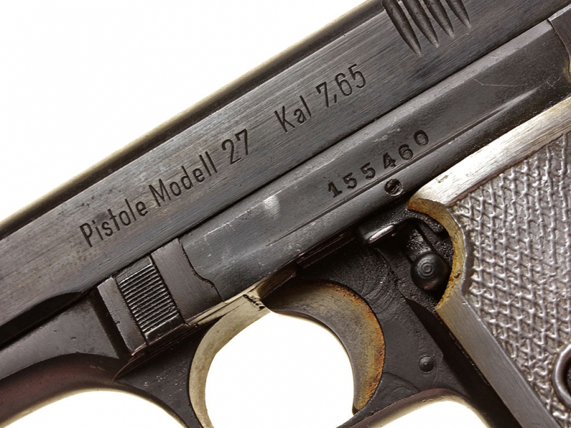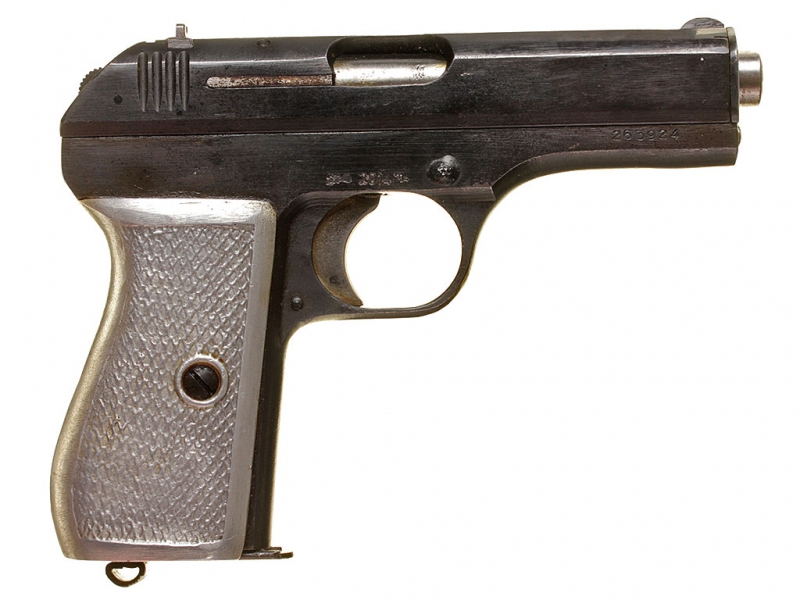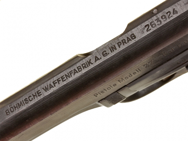 Пистолет CZ 27 калибром 7,65 мм, изготовленный во время оккупации Чехословакии Германией. Состоял на вооружении германской армии в качестве оружия ограниченного стандарта под наименованием "Pistole 27". Отличное состояние, необычный вариант исполнения рукояти в алюминиевой "рубашке".