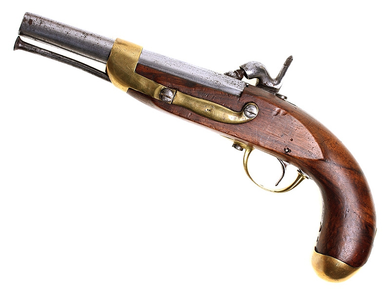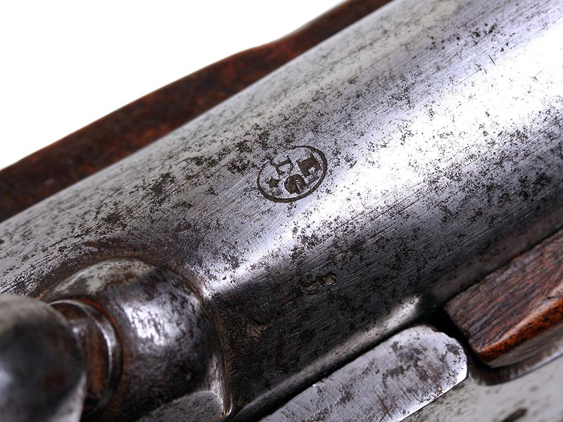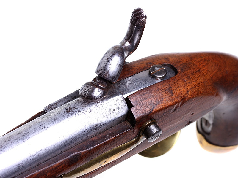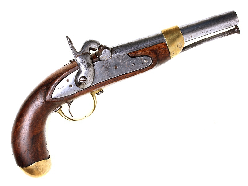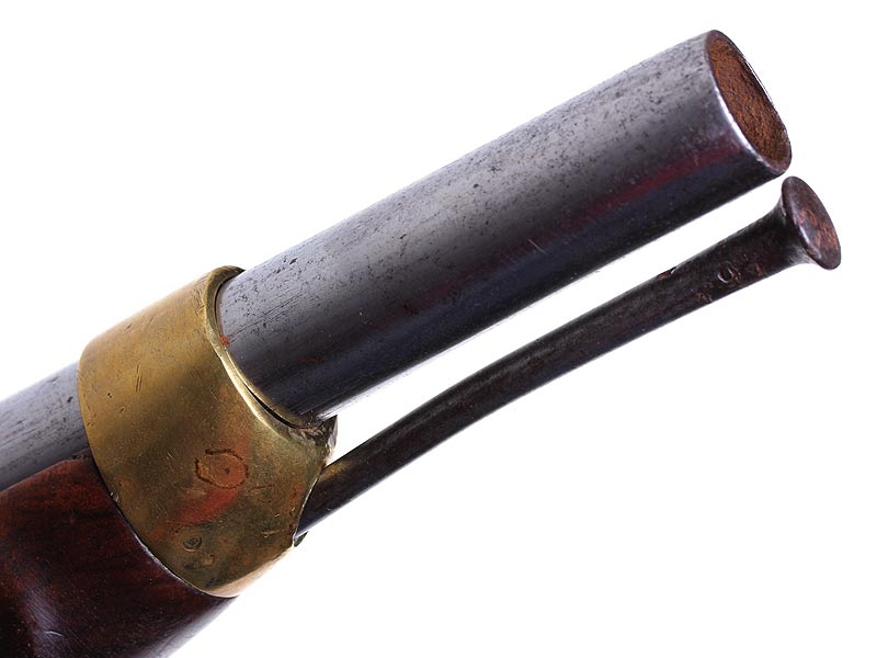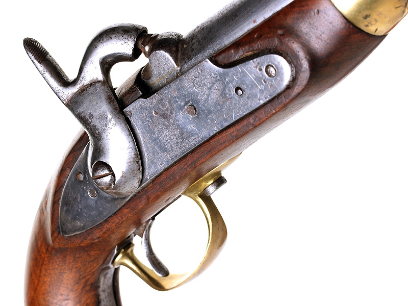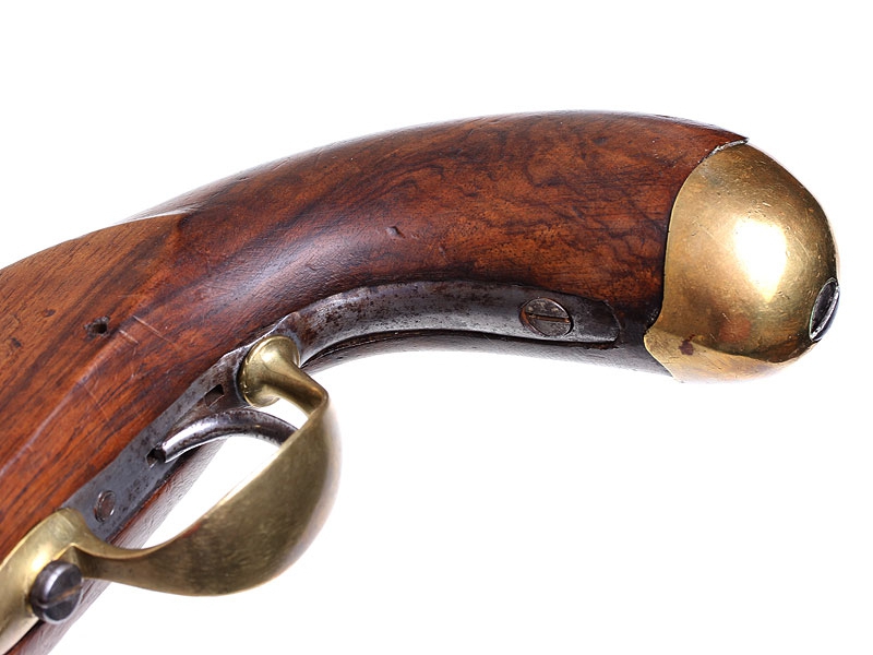 Армейский пистолет с капсюльным замком, изготовленный в середине XIX века. На стволе имеется клеймо военной приемки в Льеже. Замок исправен, без клейм. Пятка рукояти, скоба и кольцо изготовлены из латуни. На шомполе имеется клеймо "191". В целом хорошее состояние, на металлических частях - незначительные поверхностные следы коррозии.