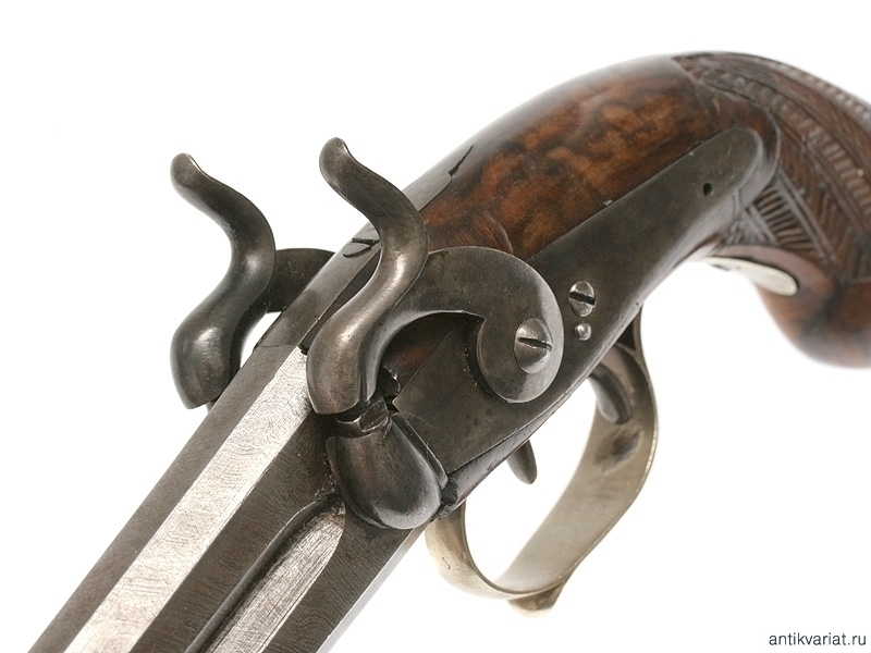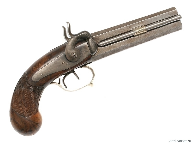 Двуствольный пистолет с капсульным замком, изготовленный в середине XIX века. Без клейм. Отличное состояние, незначительный механический дефект правого замка.
