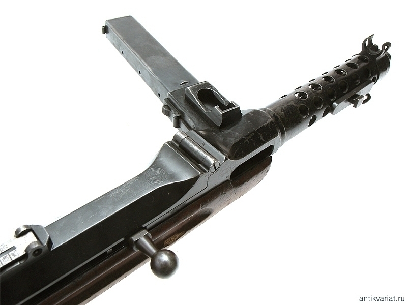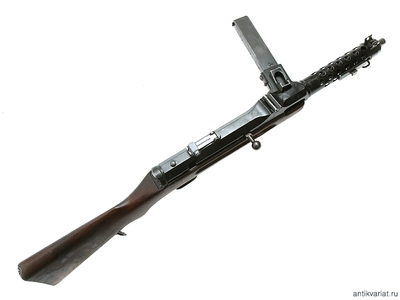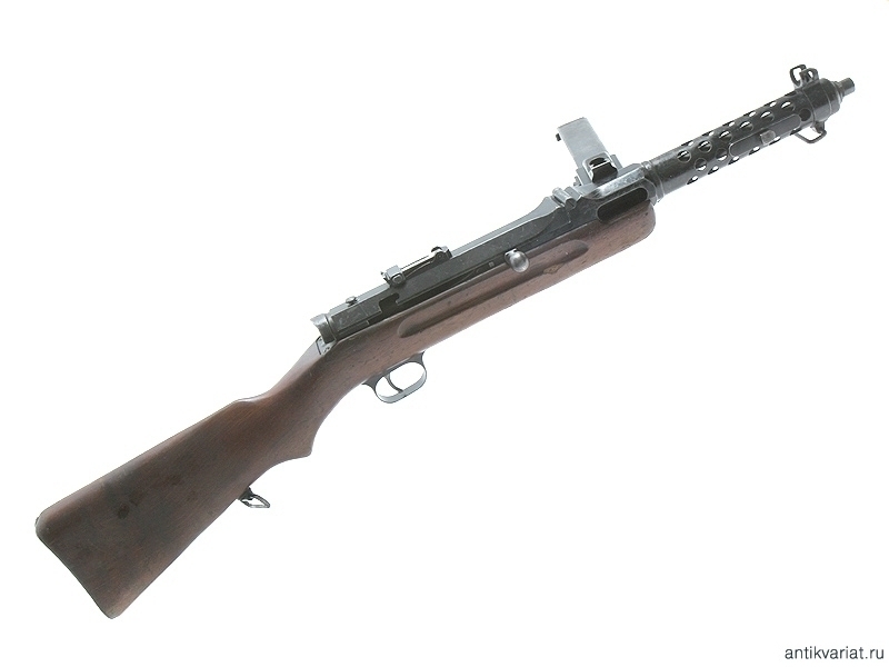 Пистолет-пулемет Штайр-Солотурн МР-34 был разработан конструктором Луисом Штанге на германской фирме «Рейнметалл» еще в 1920 г. В связи с ограничениями, предусмотренными Версальским договором в отношении Германии, производство нового оружия было налажено в Швейцарии на «Ваффенфабрик Солотурн», поскольку значительная часть акций этой фирмы принадлежала «Рейнметаллу». С 1929 по 1934 г. эти пистолеты-пулеметы производились исключительно на «Ваффенфабрик Штайр» в Австрии. Примерно в это же время МР-34 был принят на вооружение австрийской полиции. Пистолет-пулемет Штайр-Солотурн МР-34 представлял собой оружие с неподвижным стволом, автоматика которого работала по принципу отдачи свободного затвора. Исполнение пистолета-пулемета отличалось высоким качеством. Почти все его металлические детали были точеными или фрезерованными. К числу важнейших конструктивных особенностей этого оружия можно отнести приспособление, находящееся на горловине для магазина, которое было предназначено для наполнения магазинов патронами из обойм пистолета Штейр (для наполнения одного магазина требовалось 4 обоймы по 8 патронов). Кроме того, была предусмотрена возможность крепления с правой стороны ствола ножевидного штыка. Предохранитель представлял собой самостоятельную деталь на крышке ствольной коробки. Поскольку пистолет-пулемет был рассчитан на ведение как автоматического, так и одиночного огня, переводчик режима огня был расположен на левой стороне ложи. В верхней задней части каморы замка находился секторный прицел. К концу 1940 года массовое производство МР-34 было приостановлено, поскольку в 1938–1940 гг. было принято решение о некотором упрощении технологии изготовления. Следует отметить, что Штайр-Солотурн из-за использования при его изготовлении высококачественных материалов, а также сложных технологических процессов являлся одним из самых дорогостоящих среди пистолетов-пулеметов такого типа в Европе. В то же время это оружие благодаря своим качествам достаточно широко использовалось Вермахтом, войсками СС и немецкой полицией в период Второй мировой войны.