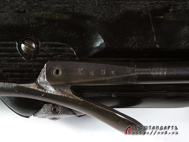 Массо-габаритный макет легендарного немецкого пистолета-пулемета Мp-38 в профессиональном коллекционном состоянии. Полностью сохранено оригинальное воронение и оксидирование. Поскольку Мр-38 изготовлялся методом фрезерования, то на нём очень чётко видны характерные следы от прохождения фрезы, что добавляет ему антуражность. Все части этого Мр-38 имеют одинаковый заводской номер, кроме того, на всех деталях стоят клейма военной приёмки – маленькие орлы с номерами.