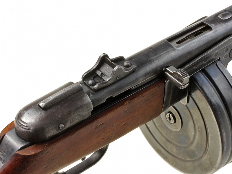 Прицельные приспособления изначально включали секторный прицел и неподвижную мушку, позже - перекидной L-образный целик с установками на 100 и 200 метров.Ранние ППШ комплектовались барабанными магазинами на 71 патрон, однако барабанные магазины были сложны и дороги в производстве, не слишком надежны и удобны, а также требовали индивидуальной пригонки под оружие, поэтому в 1942 году были разработаны рожковые (коробчатые) магазины на 35 патронов.