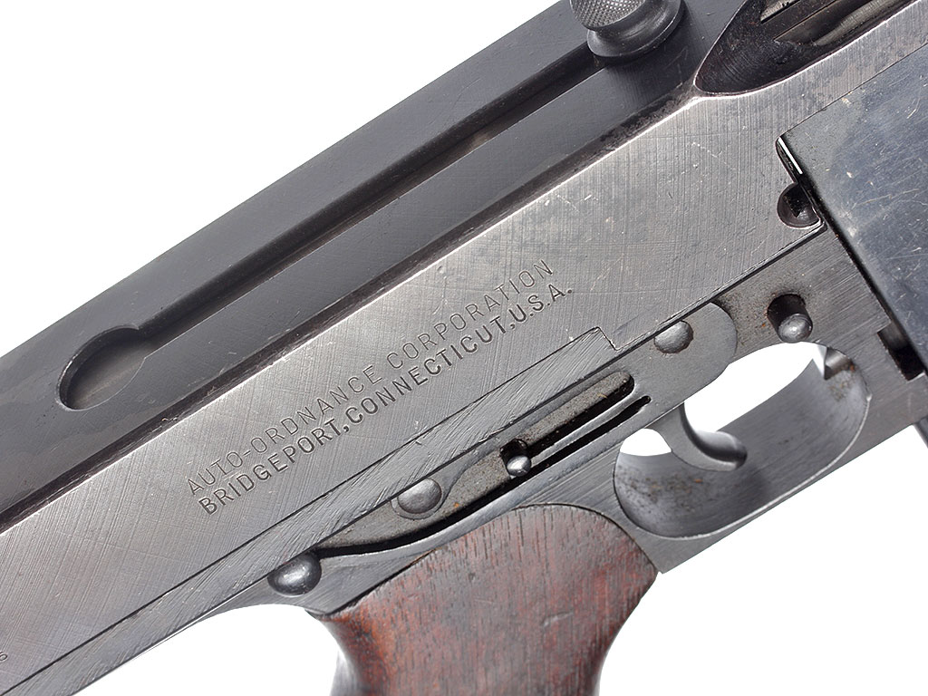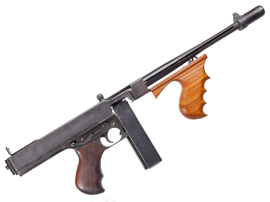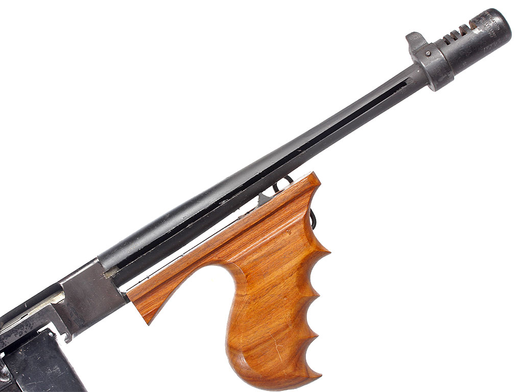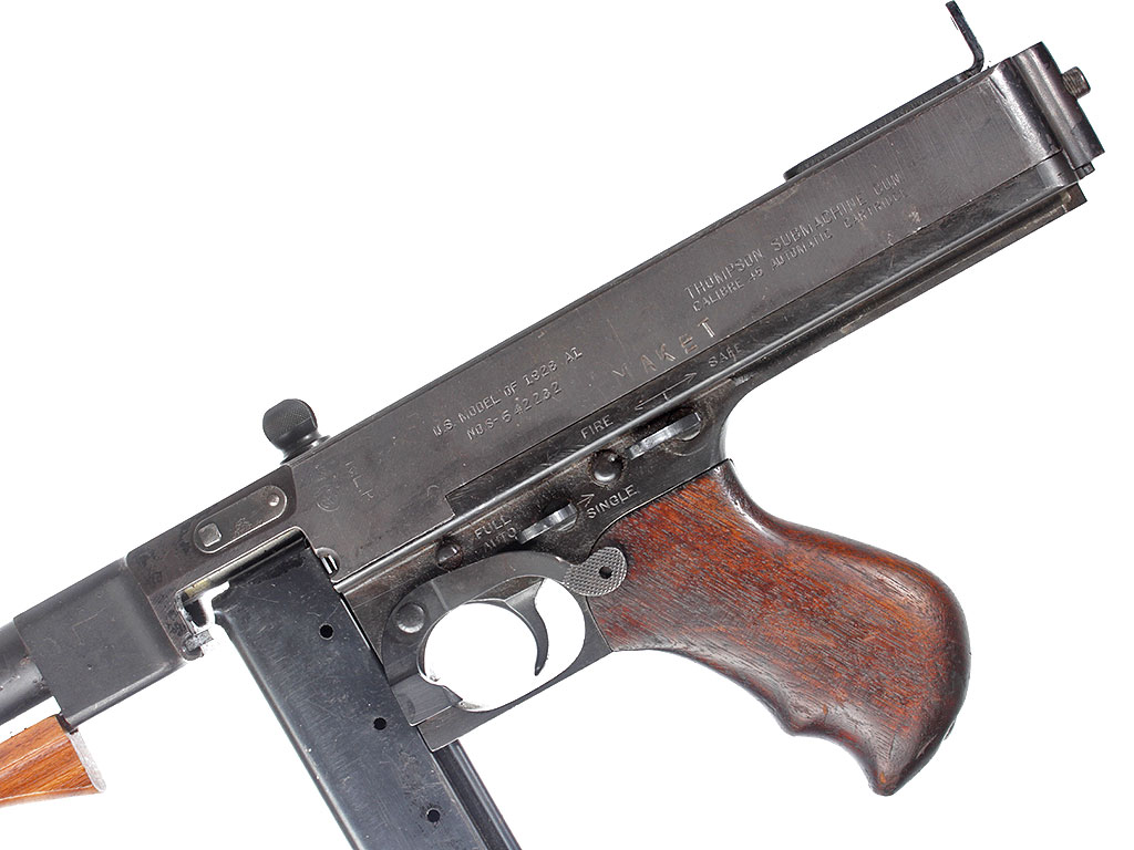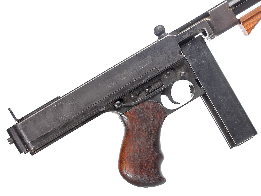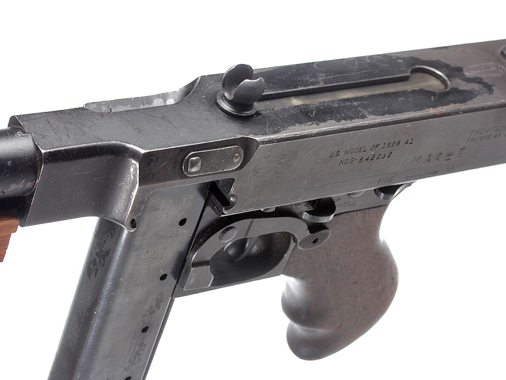 Пистолет-пулемет Томпсона образца 1928 года, модификация "А1" - позднего выпуска с гладким стволом: именно эта модификация в годы войны поставлялась в СССР по ленд-лизу. Дополнительная рукоять, установленная вместо цевья - современного изготовления. Приклад отсутствует, "гангстерский вариант".