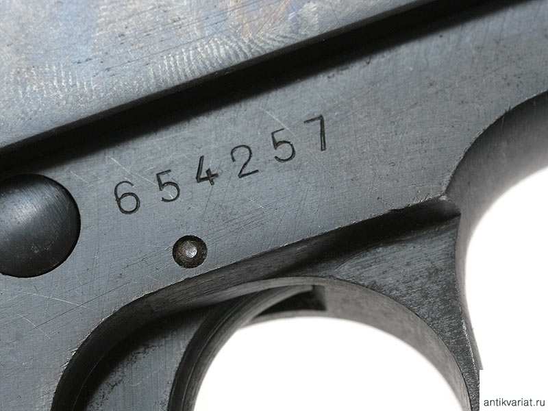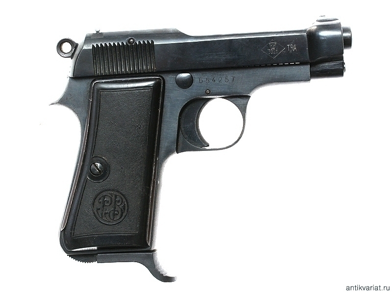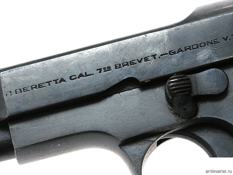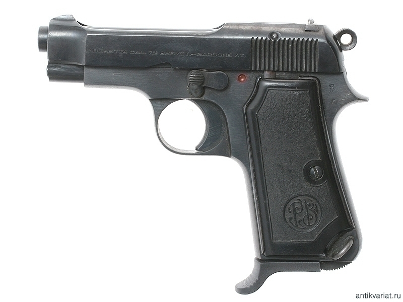 Пистолет системы Беретта образца 1934 года, выпущенный в 1942 году. Компактная модель с характерным выступом на основании обоймы для удобства охвата рукояти рукой. Примечательно, что пистолет изготовлен не под традиционный калибр 9 мм, а под калибр 7,65 мм.