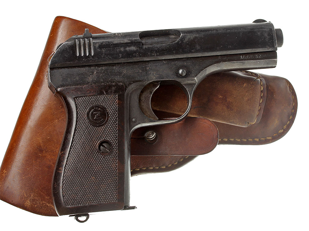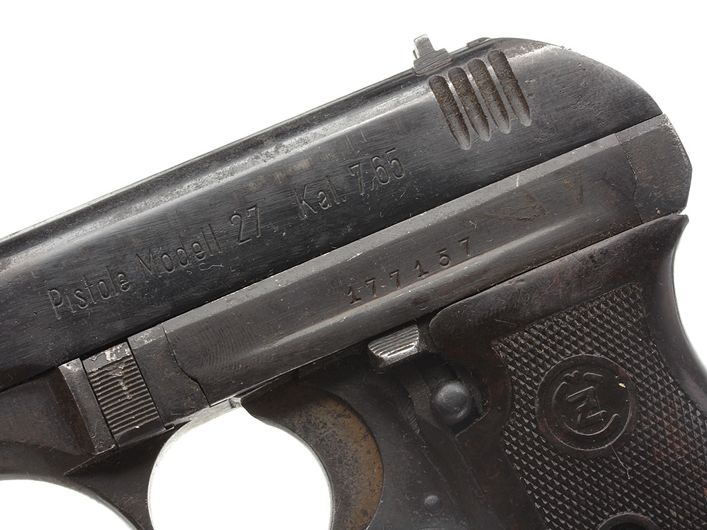 Пистолет CZ 27 калибром 7,65 мм, изготовленный во время оккупации Чехословакии Германией. Состоял на вооружении германской армии в качестве оружия ограниченного стандарта под наименованием "Pistole 27". Отличное состояние. В оригинальной кобуре 1942 года выпуска.