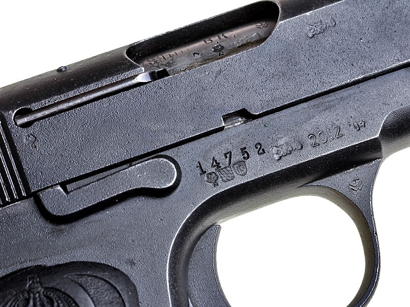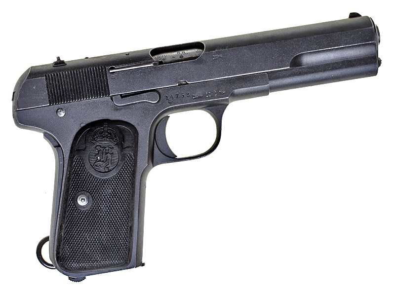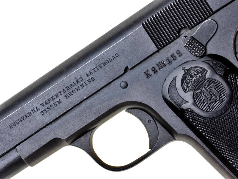 Пистолет системы Браунинга образца 1903 года, выпущенный в Швеции фирмой "Гускварна" ("Huskvarna"). Достаточно редкая модель, рама и затвор имеют матовую "шагреневую" поверхность. Отличное состояние.