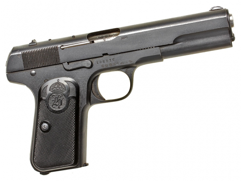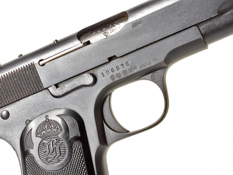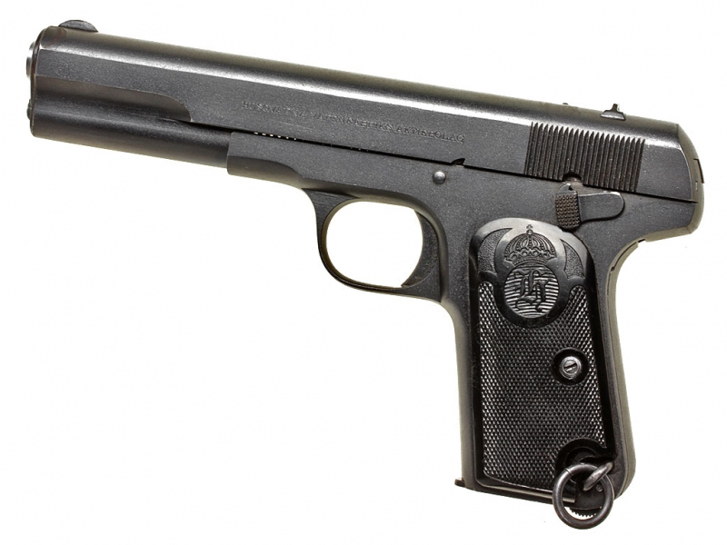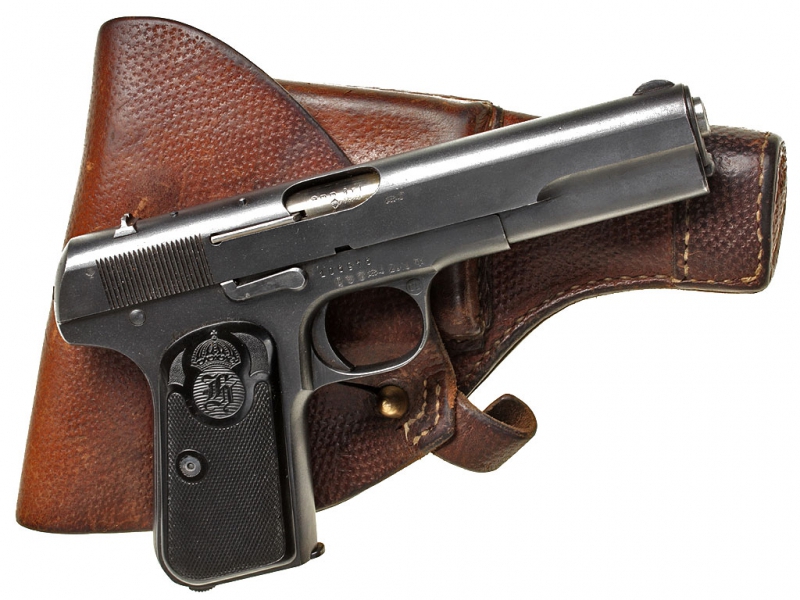 Пистолет системы Браунинга образца 1903 года, выпущенный в Швеции фирмой "Гускварна" ("Huskvarna"). Достаточно редкая модель, рама и затвор имеют матовую "шагреневую" поверхность. Отличное состояние, оригинальная кобура.
