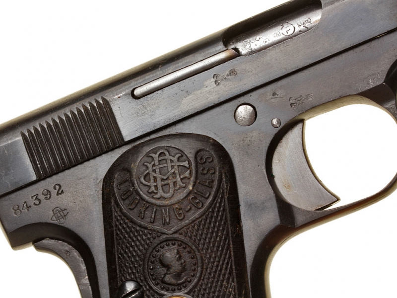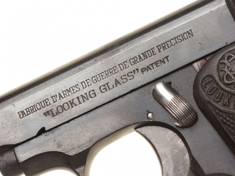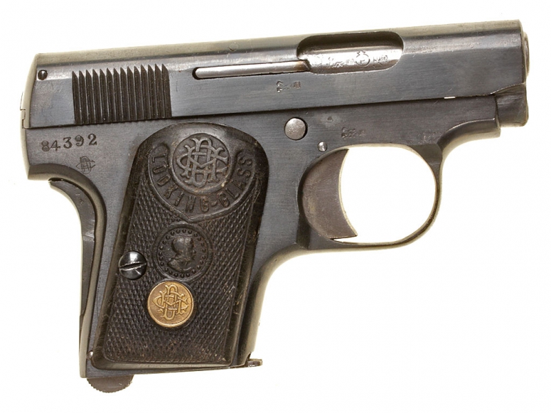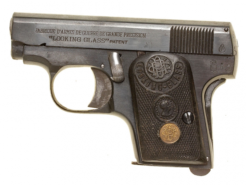 Другой пистолет калибра 6,35 мм, созданный на основе конструкции "Браунинга" 1906 года, обладал гораздо более привлекательной внешней отделкой, чем "Атлас". На затворе-кожухе всегда присутствует надпись "LOOKING GLASS", а на щечках рукоятки могут быть выдавлены либо слово "PATENT", либо зарегистрированная торговая марка "Доминго Ача и К°" - женская головка в рамке, похожей на карманное зеркальце. Этот пистолет выпускался в нескольких вариантах: наиболее часто встречающийся из них имеет размеры "Браунинга" и ствол длиной два дюйма, который полностью закрыт затвором-кожухом.