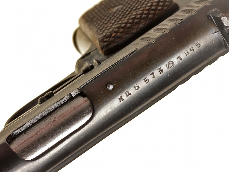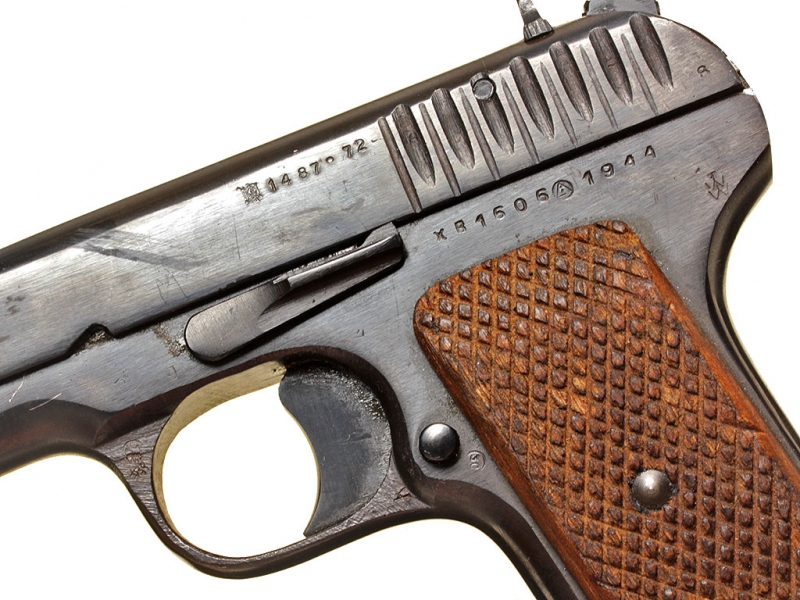 Пистолет системы Токарева образца 1930/33 года. Выпуск 1944 года, деревянные накладки рукояти, номера не совпадают.