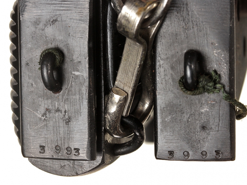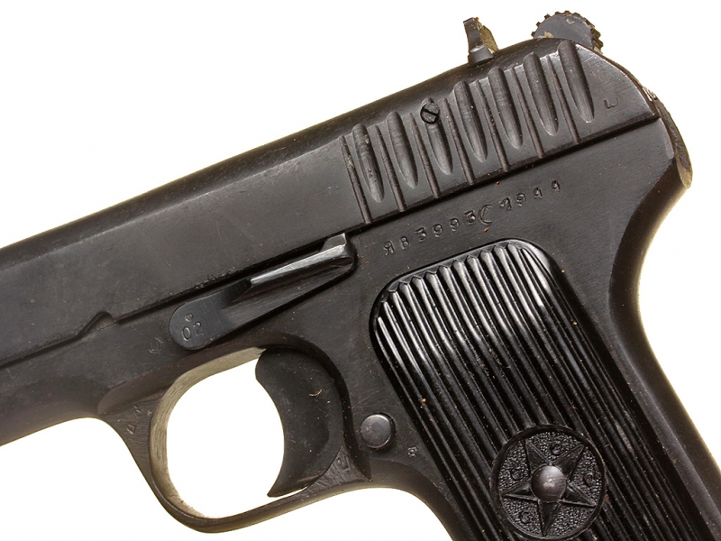 Пистолет системы Токарева образца 1930/33 года. Пистолет выпуска 1944 года, в кожаной послевоенной кобуре. На одном номере, отличное состояние. Запасной магазин в комплекте от этого же пистолета, с совпадающим номером.