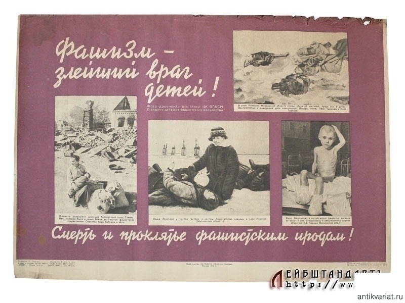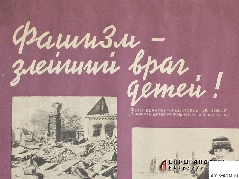 Плакат "Фашизм - злейший враг детей!", выпущенный в 1942 году. Содержит фотодокументы выставки ЦК ВЛКСМ "В защиту детей от фашистского варварства". Очень хорошее состояние.