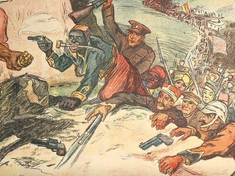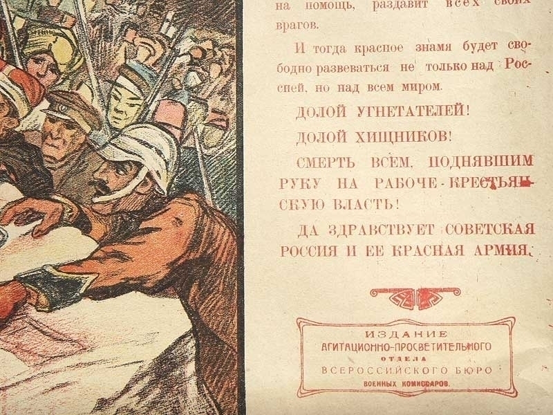 Плакат периода Гражданской войны "Нападение империалистов на Советскую Россию". Издание Агитационно-просветительного отдела Всероссийского Бюро Военных Комиссаров. Типо-литография "Печатник", Москва.