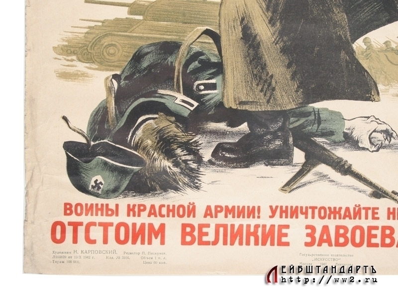 Плакат "Воины Красной Армии! Уничтожайте немецких захватчиков! Отстоим великие завоевания Октября!". Выпущен государственным издательством "Искусство" в октябре 1942 года. Отличное состояние.