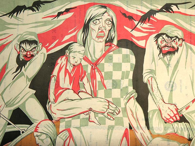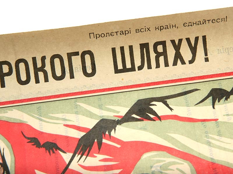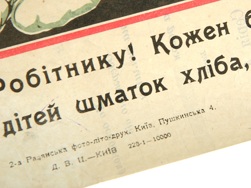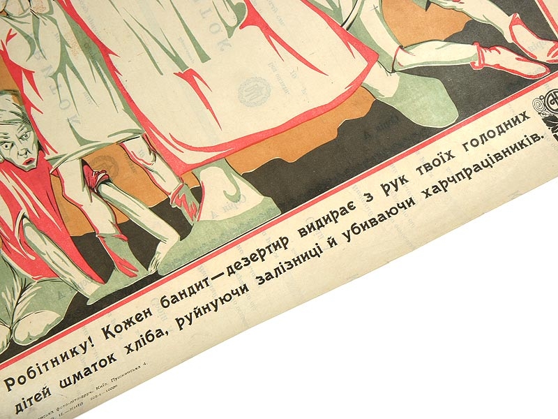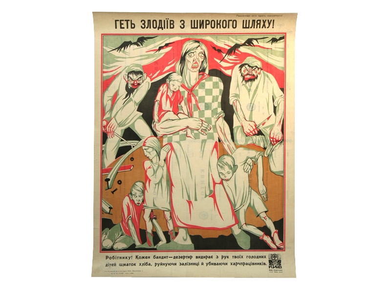 Плакат периода Гражданской войны "Прочь бандитов с большой дороги! Трудящийся! Каждый бандит-дезертир выдирает из рук твоих голодных детей кусок хлеба, разрушая железные дороги и убивая продработников.". Киев, Государственное издательство. На украинском языке.