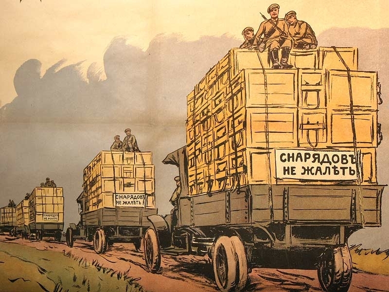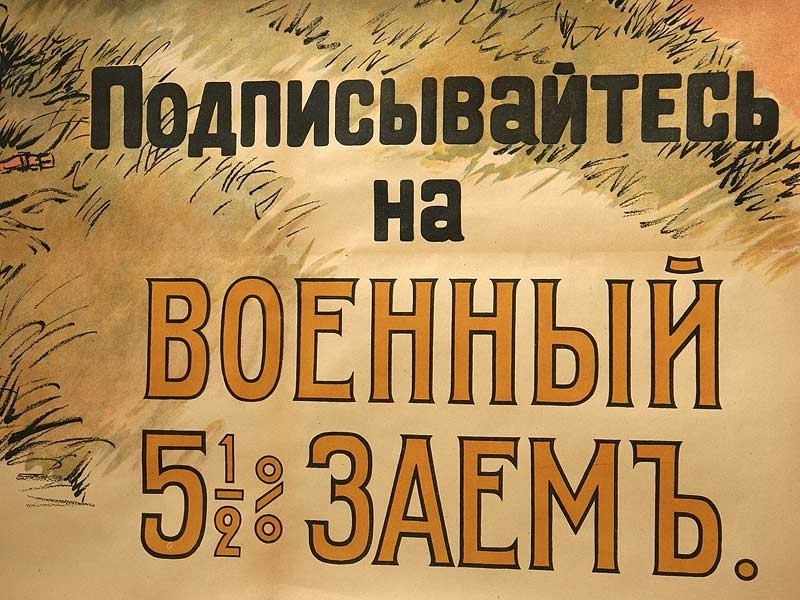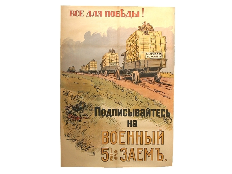 Плакат периода Первой мировой войны "Все для победы! Подписывайтесь на военный 5,5% заем". Петроград, 1916 год.