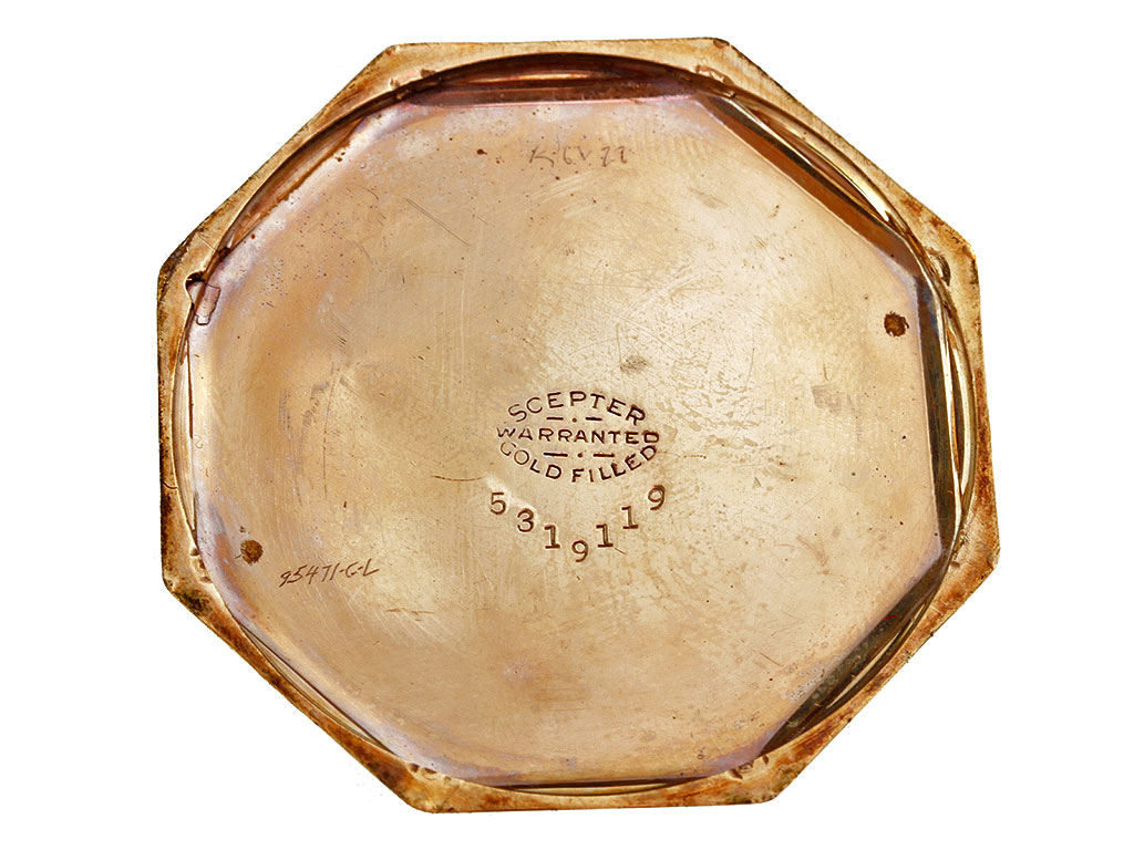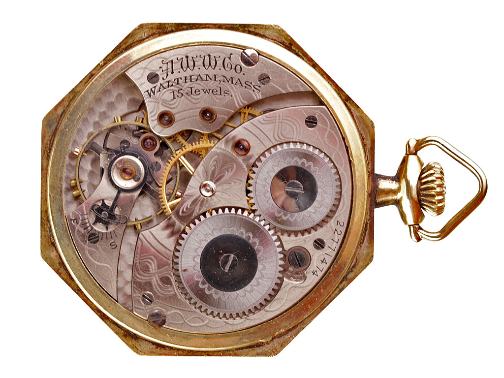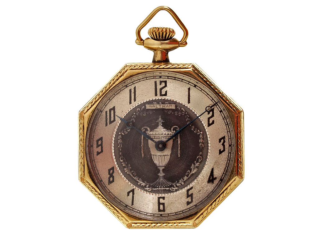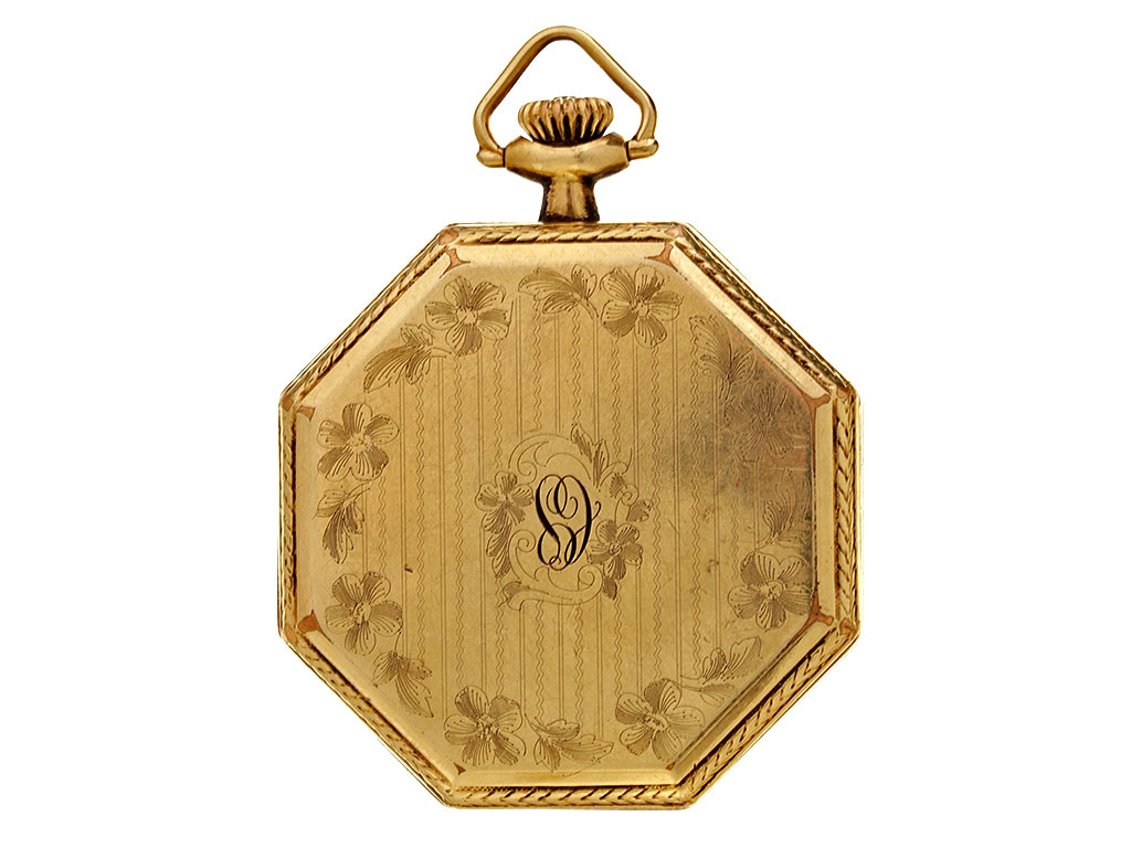 Карманные часы в восьмиугольном (октагональном) корпусе, изготовленные фирмой American Waltham Watch Company в 1919 году (судя по серийному номеру механизма).